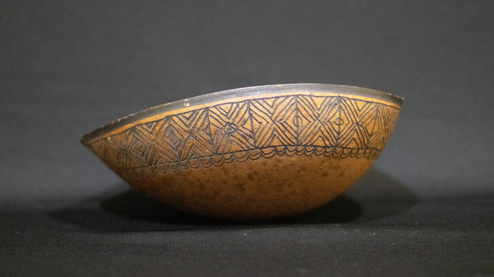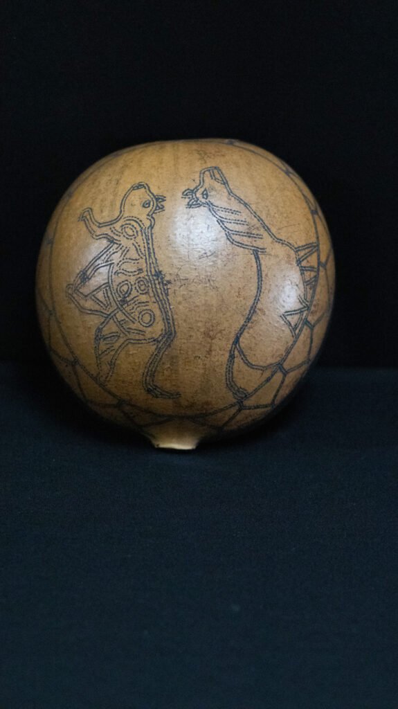 Cuia confeccionada com o fruto maduro da cuieira cortado ao meio. Apresenta parte interna tingida de preto com tinta de cumatê e externa com desenho e marca de jabuti.