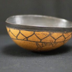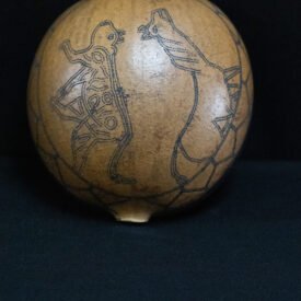 Cuia confeccionada com o fruto maduro da cuieira cortado ao meio. Apresenta parte interna tingida de preto com tinta de cumatê e externa com desenho e marca de jabuti.