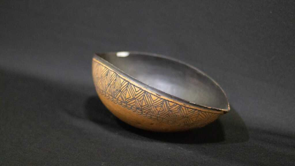 Cuia confeccionada com o fruto maduro da cuieira cortado ao meio. Apresenta parte interna tingida de preto e externa com listra preta, kuahí grande, dãdelo e escama de peixe.