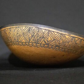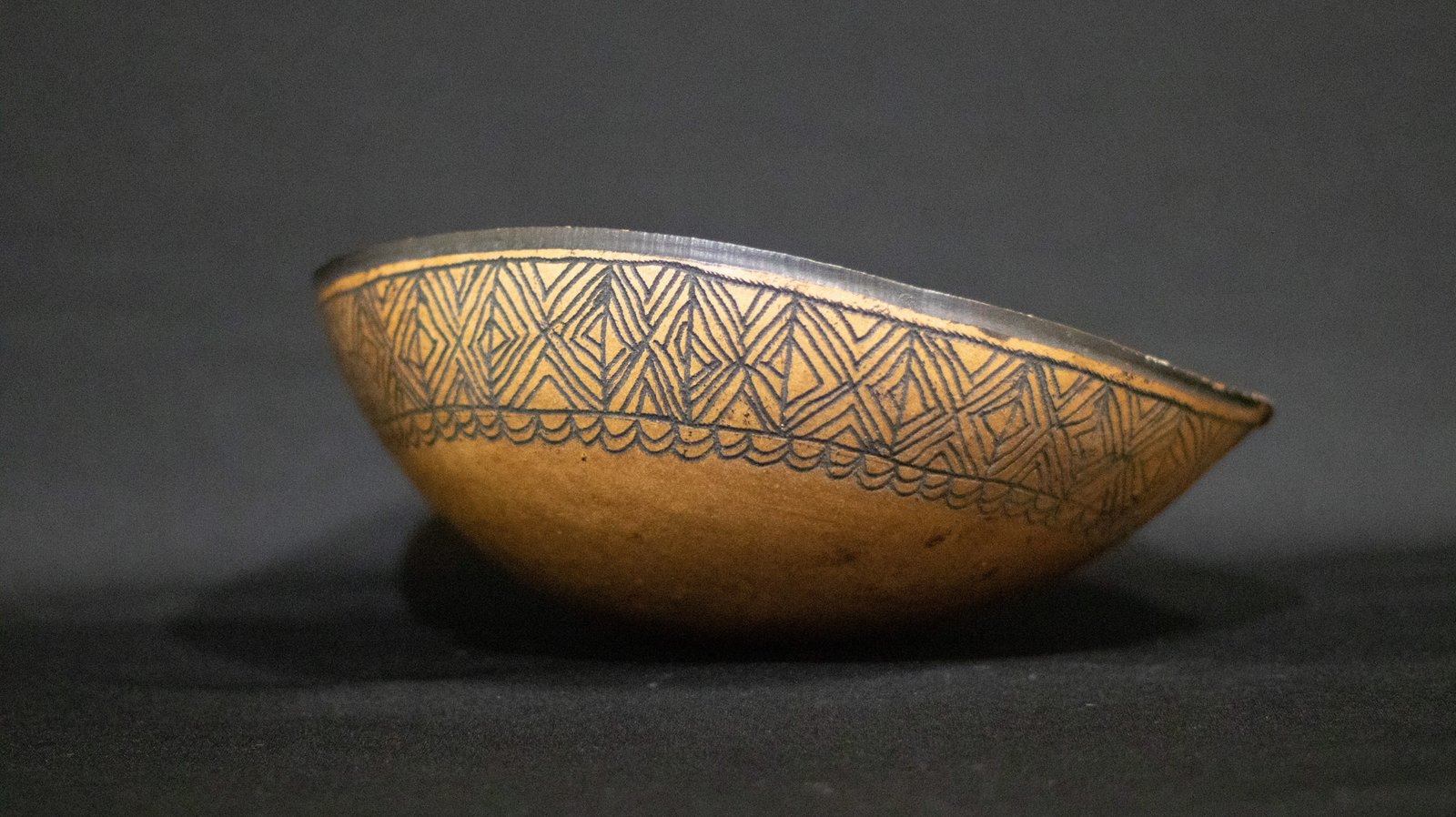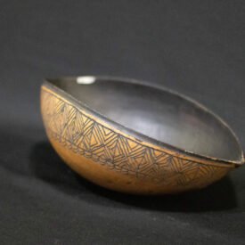 Cuia confeccionada com o fruto maduro da cuieira cortado ao meio. Apresenta parte interna tingida de preto e externa com listra preta, kuahí grande, dãdelo e escama de peixe.