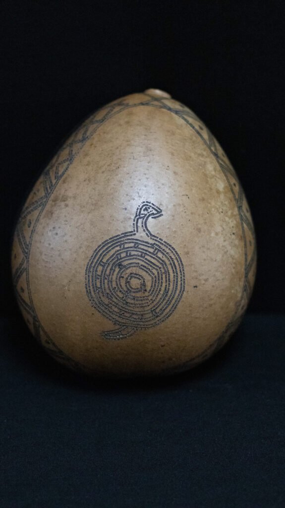 Cuia confeccionada com o fruto maduro da cuieira cortado ao meio. Apresenta parte interna tingida de preto e externa com marca kuahí e cobra, dandelô e desenho de cobra.