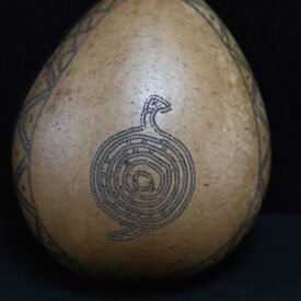Cuia confeccionada com o fruto maduro da cuieira cortado ao meio. Apresenta parte interna tingida de preto e externa com marca kuahí e cobra, dandelô e desenho de cobra.