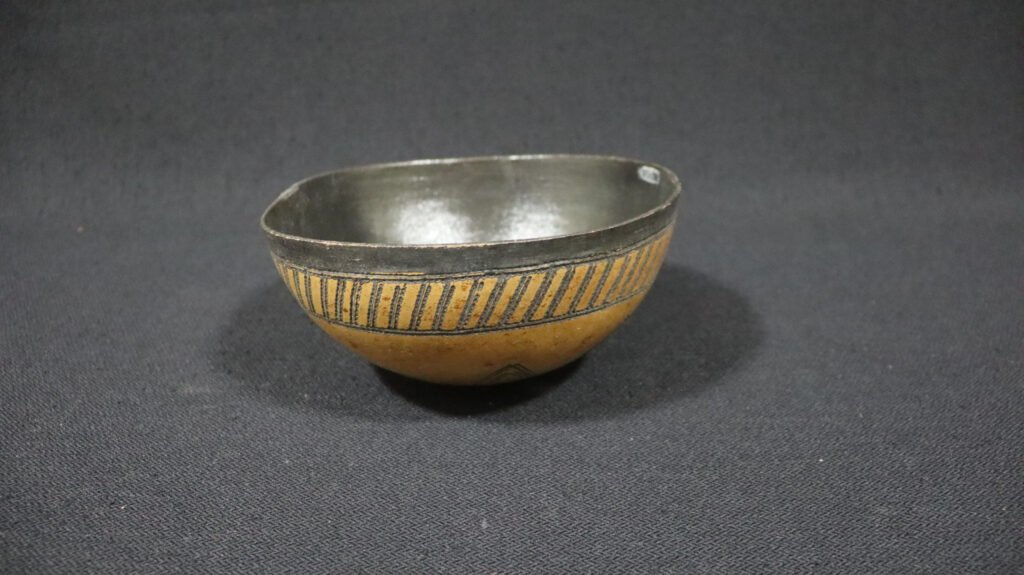Cuia confeccionada com o fruto maduro da cuieira cortado ao meio. Apresenta parte interna tingida de preto e externa com listra preta, desenho de tatu, camaleão e marca espinha de peixe.