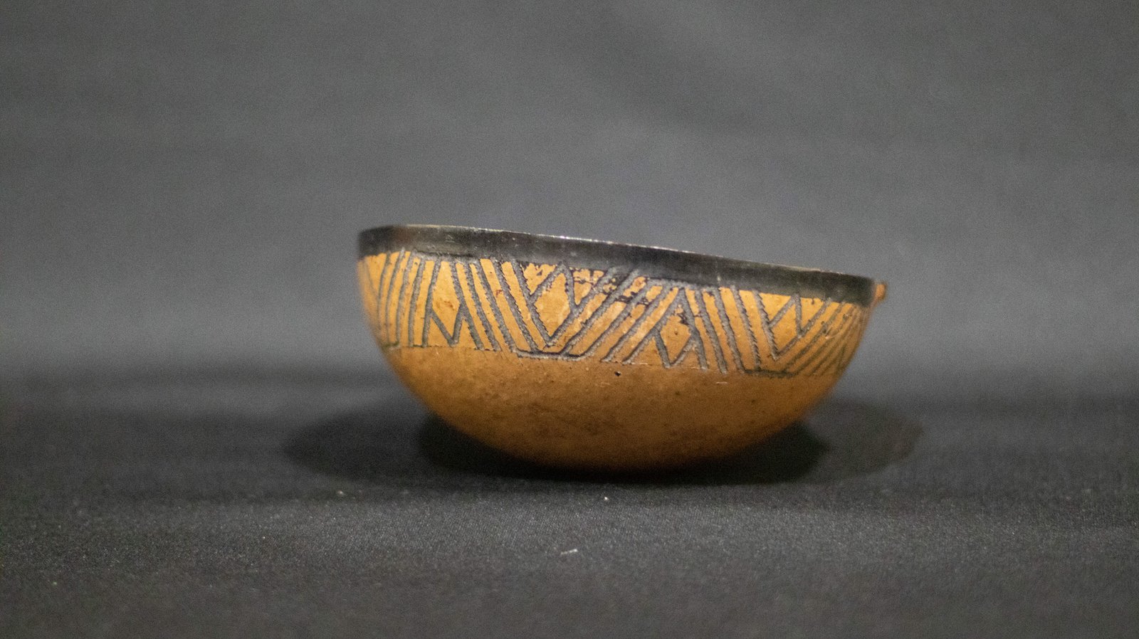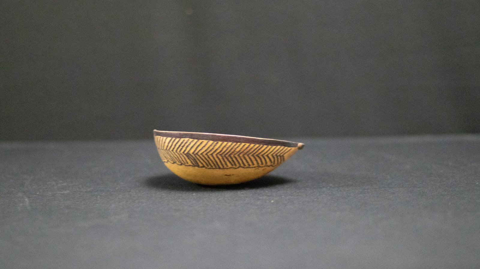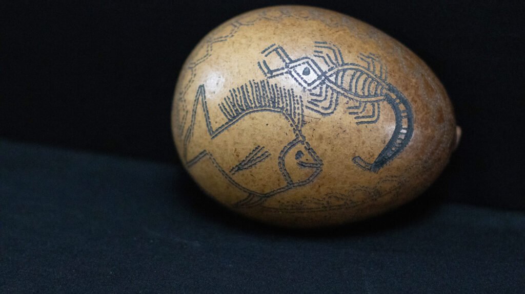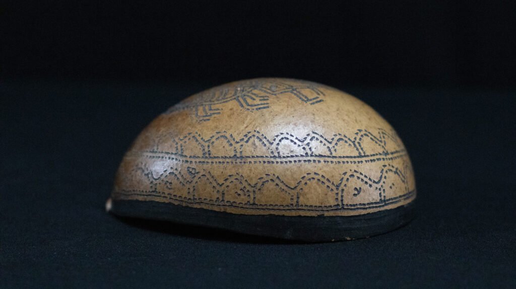 Cuia confeccionada com o fruto maduro da cuieira cortado ao meio. Apresenta parte interna tingida de preto e externa com listra preta, desenho de peixe piranha, escorpião e marca do jabuti.
