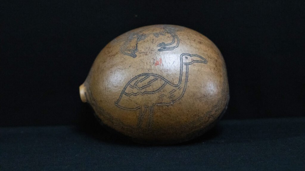 Cuia confeccionada com o fruto maduro da cuieira cortado ao meio. Apresenta parte interna tingida de preto e externa com listra preta, marca dãdelo e desenho de caranguejo e garça.