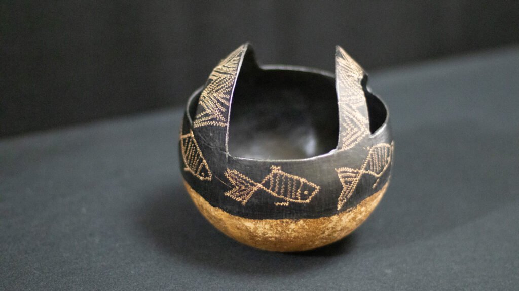 Cuia confeccionada com o fruto maduro da cuieira cortado deixando duas alças. Apresenta parte interna, alças e borda externa tingidas de preto com tinta de cumatê. Exibe sobre a tintura preta da borda decoração com listra preta, marca de dãdelo e desenho de peixes.