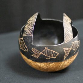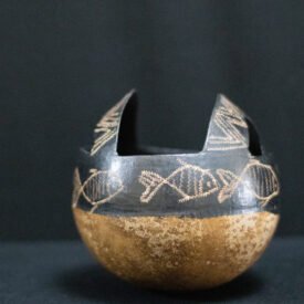 Cuia confeccionada com o fruto maduro da cuieira cortado deixando duas alças. Apresenta parte interna, alças e borda externa tingidas de preto com tinta de cumatê. Exibe sobre a tintura preta da borda decoração com listra preta, marca de dãdelo e desenho de peixes.