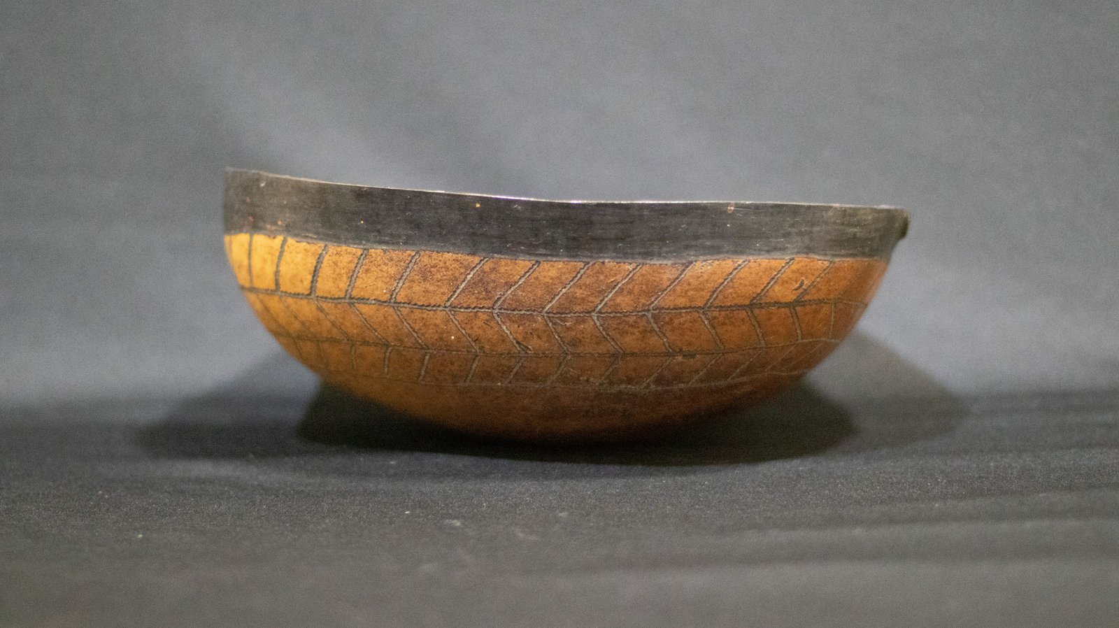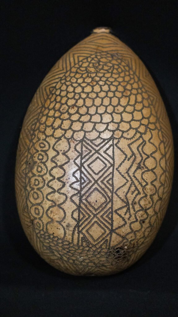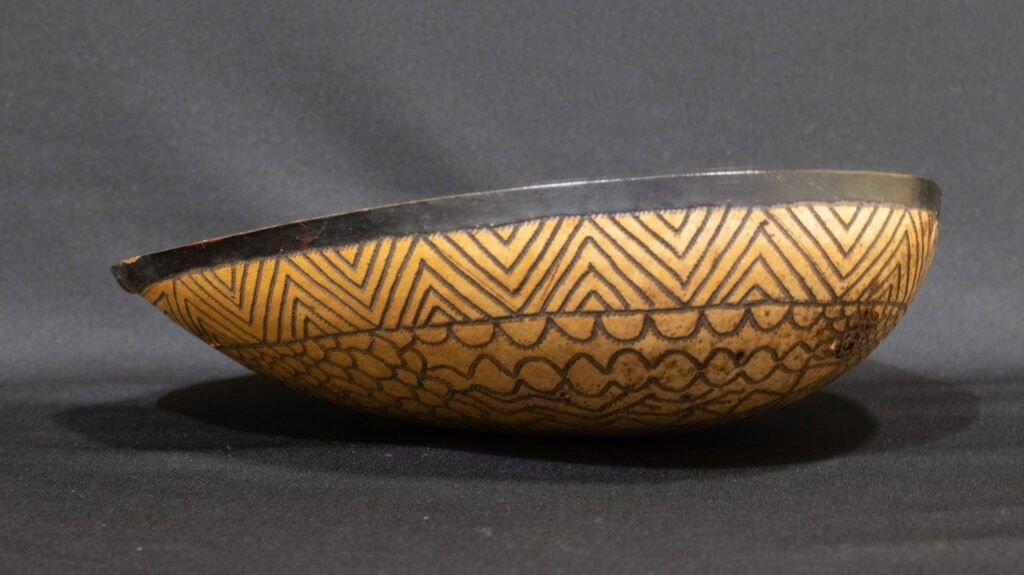 Cuia confeccionada com o fruto maduro da cuieira cortado ao meio. Apresenta parte interna tingida de preto com tinta de cumatê e externa com listras preta, kuahí grande, escama de peixe e dãdelo.