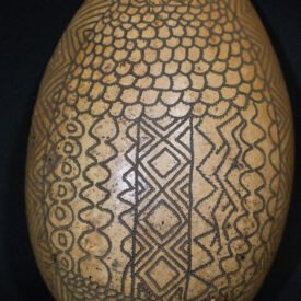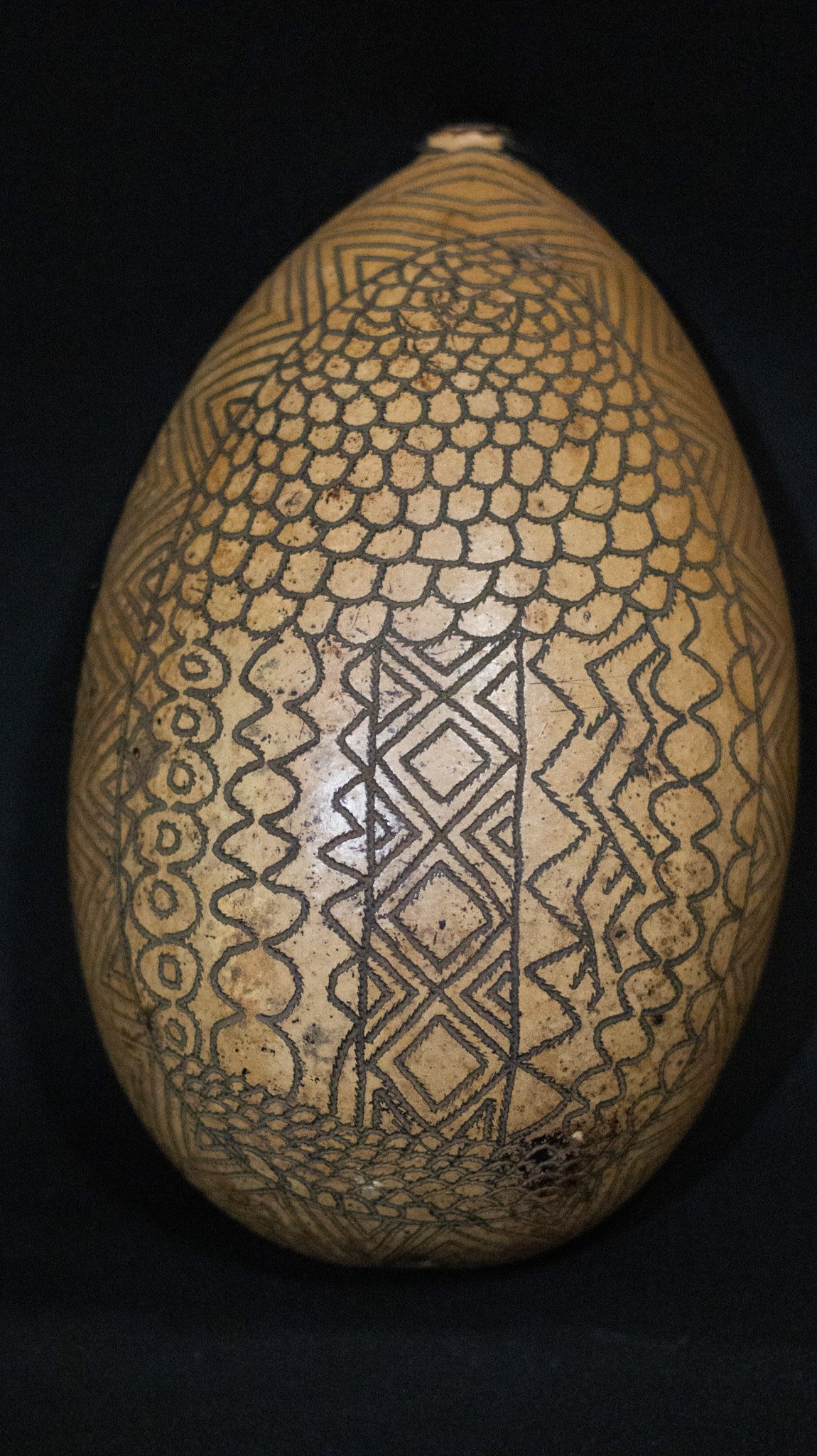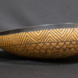 Cuia confeccionada com o fruto maduro da cuieira cortado ao meio. Apresenta parte interna tingida de preto com tinta de cumatê e externa com listras preta, kuahí grande, escama de peixe e dãdelo.