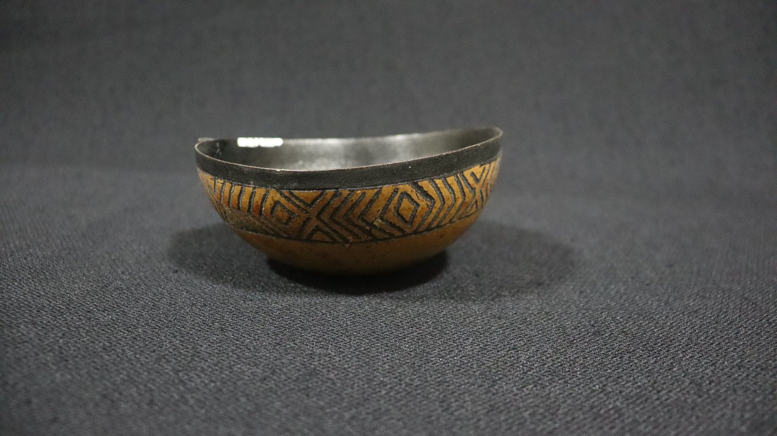 Cuia confeccionada com o fruto maduro da cuieira cortado ao meio. Apresenta parte interna tingida de preto com corante de cumatê e externa com decorada com incisões geométricas na cor preto do mesmo corante.