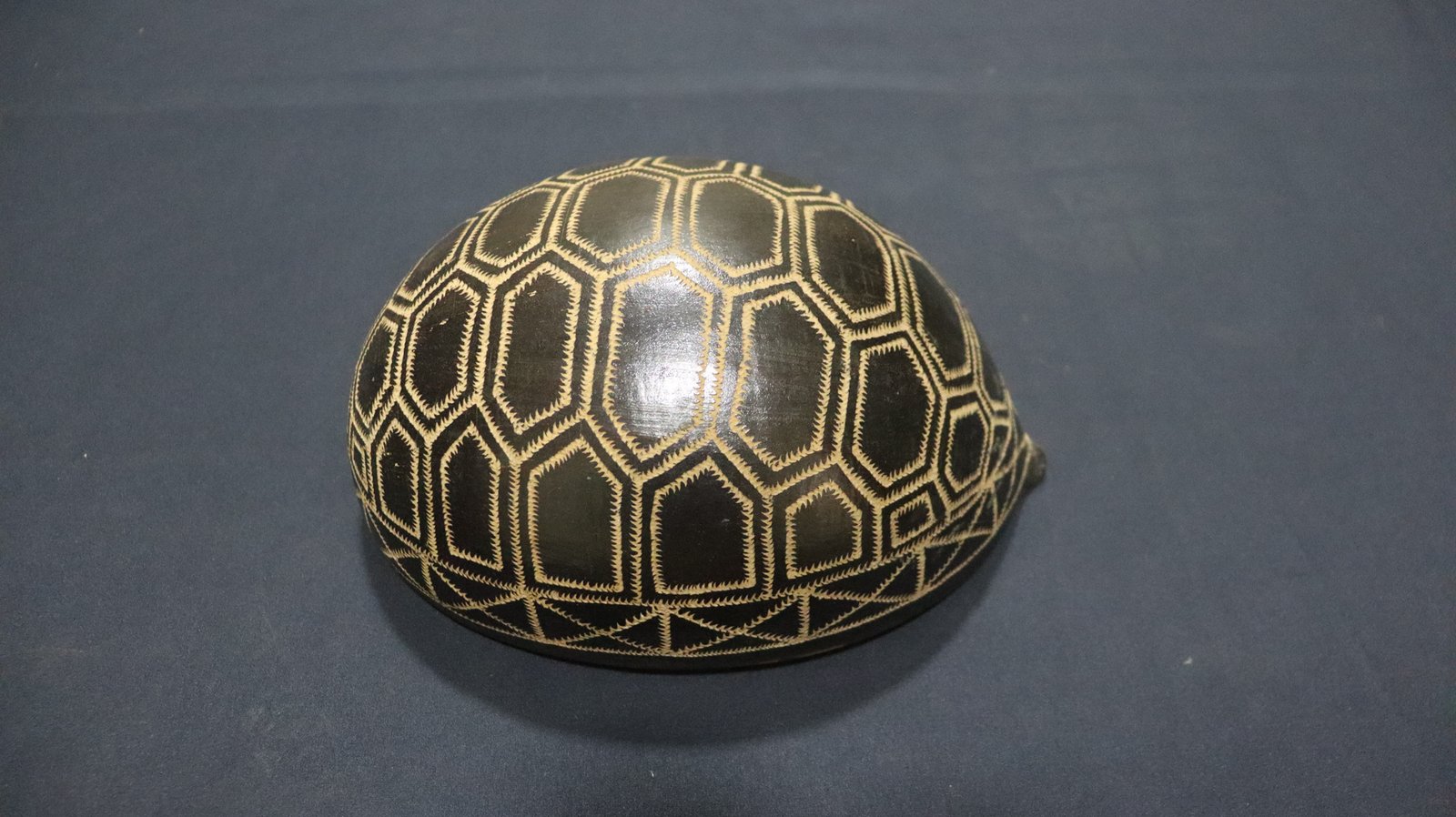 Cuia confeccionada com o fruto maduro da cuieira cortado ao meio. Apresenta parte interna tingida de preto com corante de cumatê e externa com decorada com incisões em forma de meandros na cor preto do mesmo corante.