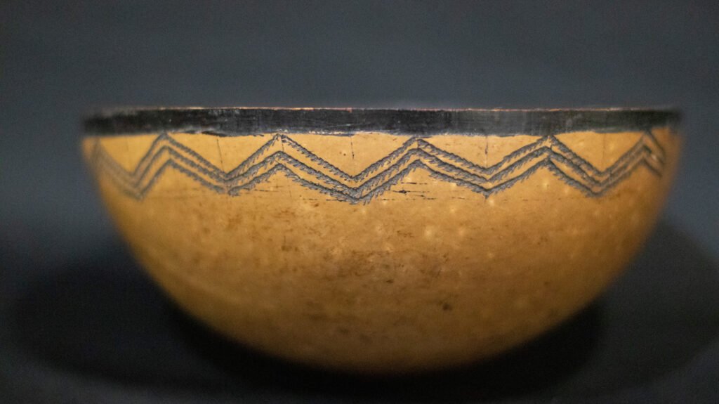 Cuia confeccionada com o fruto maduro da cuieira cortado ao meio. Apresenta parte interna tingida de preto com tinta de cumatê e externa com listras preta e dãdelo.