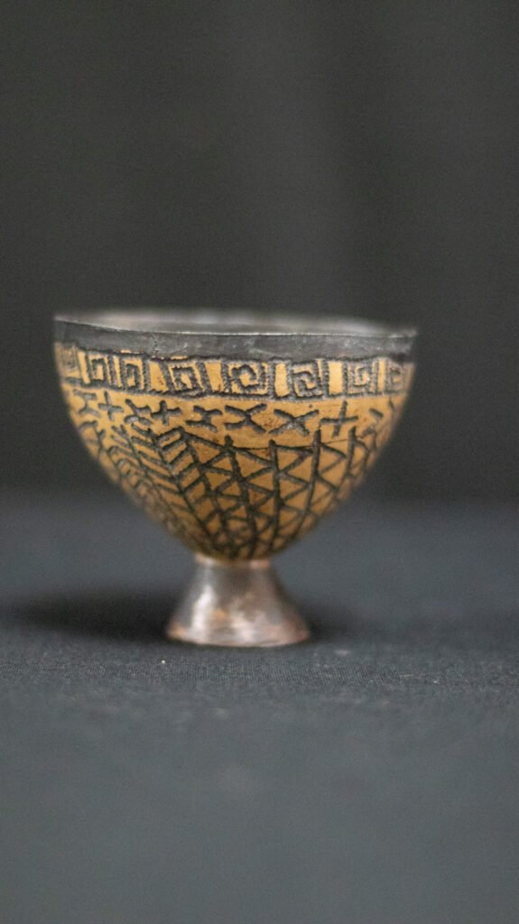 A cuia é confeccionada a partir do fruto maduro da cuieira, cortado ao meio e esvaziado de seu miolo. A parte interna é raspada e laqueada com tinta de kumatê, um pigmento natural extraído da casca da árvore de mesmo nome. O processo de obtenção do kumatê envolve a remoção da casca, que é então macerada, fervida até atingir uma consistência espessa e escura e, após esfriar, utilizada para pintar a cuia.Após a aplicação da tinta, a peça passa por um tratamento específico para intensificar sua coloração e brilho. Ela é colocada sobre cinzas misturadas com xixi, o que confere à superfície um tom negro profundo e um acabamento brilhante característico. Além do tratamento interno, a parte externa da cuia é pintada.Após a aplicação da tinta, a peça passa por um tratamento específico para intensificar sua coloração e brilho. Ela é colocada sobre cinzas misturadas com xixi, o que confere à superfície um tom negro profundo e um acabamento brilhante característico. Além do tratamento interno, a parte externa da cuia é pintada. 06/05/24: bom estado de conservação.
