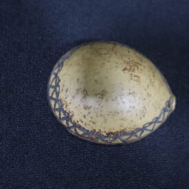 A cuia é confeccionada a partir do fruto maduro da cuieira, cortado ao meio e esvaziado de seu miolo. A parte interna é raspada e laqueada com tinta de kumatê, um pigmento natural extraído da casca da árvore de mesmo nome. O processo de obtenção do kumatê envolve a remoção da casca, que é então macerada, fervida até atingir uma consistência espessa e escura e, após esfriar, utilizada para pintar a cuia.Após a aplicação da tinta, a peça passa por um tratamento específico para intensificar sua coloração e brilho. Ela é colocada sobre cinzas misturadas com xixi, o que confere à superfície um tom negro profundo e um acabamento brilhante característico. Além do tratamento interno, a parte externa da cuia é pintada.Após a aplicação da tinta, a peça passa por um tratamento específico para intensificar sua coloração e brilho. Ela é colocada sobre cinzas misturadas com xixi, o que confere à superfície um tom negro profundo e um acabamento brilhante característico. Além do tratamento interno, a parte externa da cuia é pintada. 06/05/24: bom estado de conservação.