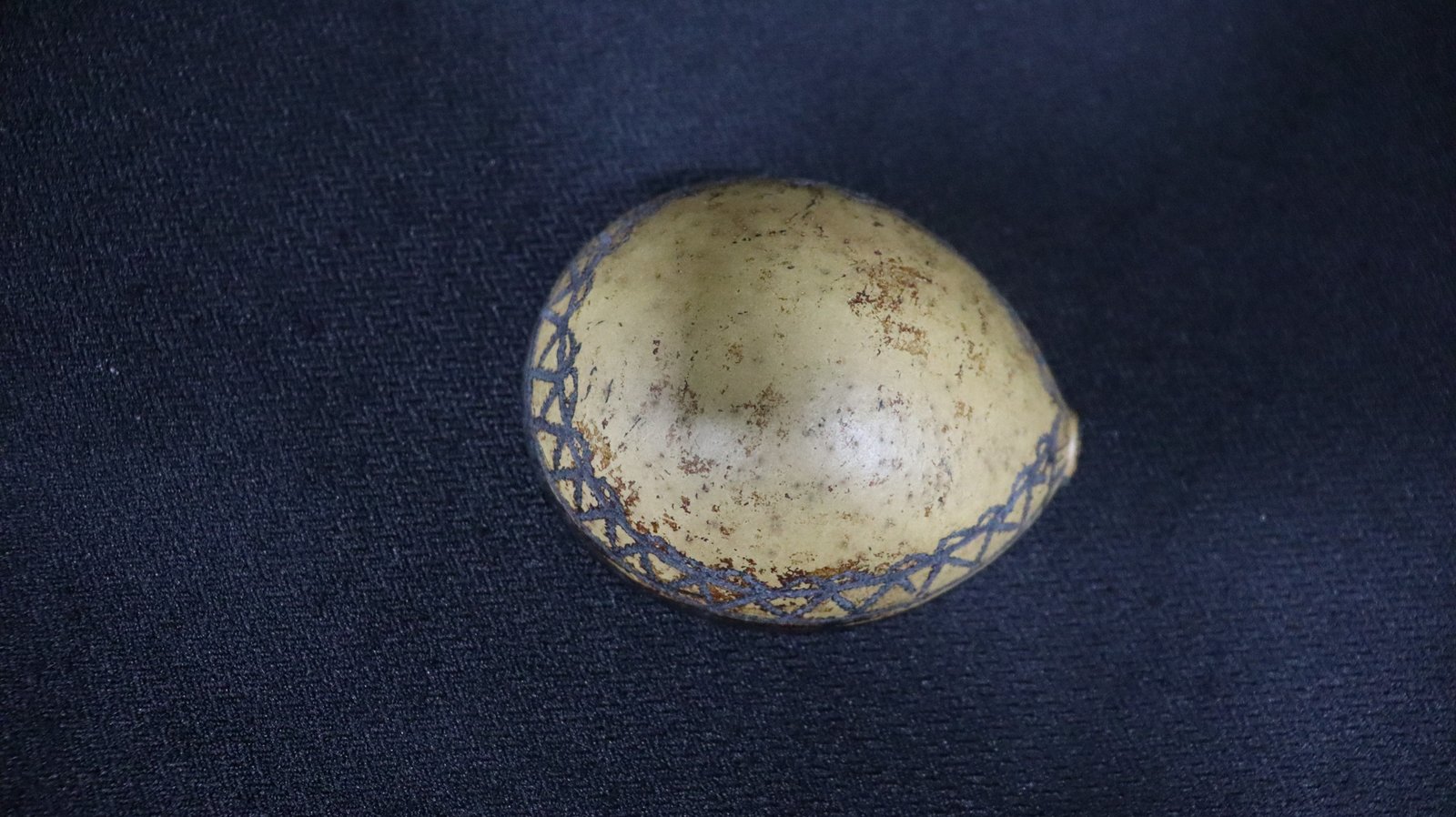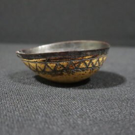 Cuia confeccionada a partir do fruto maduro da cuieira (Crescentia cujete), cortado ao meio. Apresenta formato semiesférico e uma pequena protuberância na borda. A superfície externa exibe decoração composta por um padrão geométrico de triângulos dispostos em sequência, formando uma faixa contínua ao longo da borda, pintada em preto sobre o fundo natural do fruto. A borda superior também é enegrecida, criando um contraste visual com o restante da peça.
