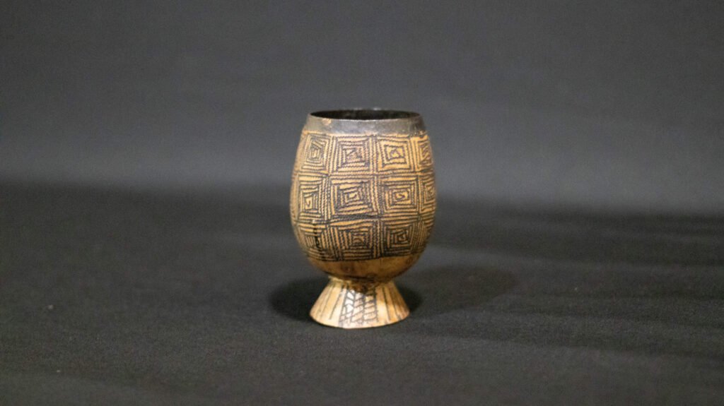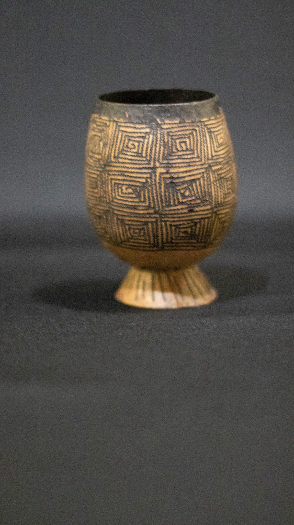 Recipiente em forma de cálice, confeccionado a partir do fruto maduro da cuieira (Crescentia cujete). Apresenta base circular levemente expandida, proporcionando estabilidade. A superfície externa é decorada com padrões geométricos incisos, compostos por motivos retangulares concêntricos dispostos de maneira uniforme, formando um efeito de espiral. A base exibe linhas radiais que convergem para o centro. O interior do recipiente é tingido de preto.
