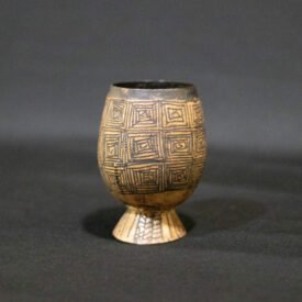 Recipiente em forma de cálice, confeccionado a partir do fruto maduro da cuieira (Crescentia cujete). Apresenta base circular levemente expandida, proporcionando estabilidade. A superfície externa é decorada com padrões geométricos incisos, compostos por motivos retangulares concêntricos dispostos de maneira uniforme, formando um efeito de espiral. A base exibe linhas radiais que convergem para o centro. O interior do recipiente é tingido de preto.
