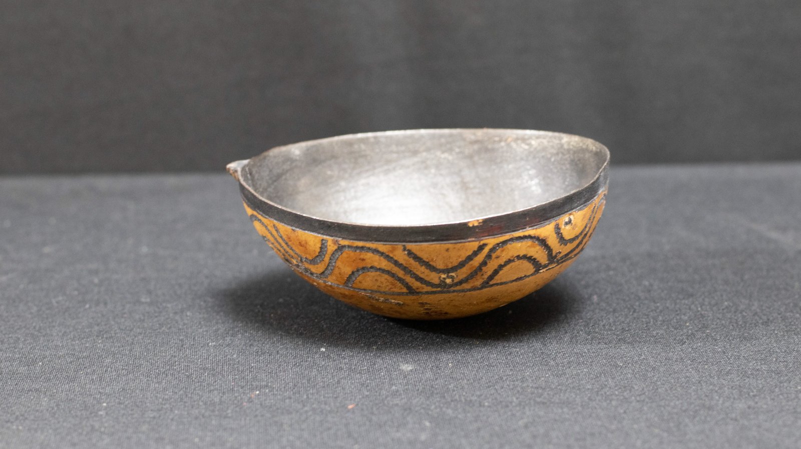 Recipiente em forma de cálice, confeccionado a partir do fruto maduro da cuieira (Crescentia cujete). Apresenta base circular levemente expandida, proporcionando estabilidade. A superfície externa é decorada com padrões geométricos incisos e pintados em preto, distribuídos em faixas distintas. A faixa superior exibe motivos lineares em espiral, enquanto a faixa intermediária contém formas cruzadas e padrões em grelha. A base do cálice também apresenta coloração escura. O interior do recipiente é tingido de preto.
