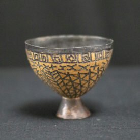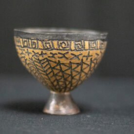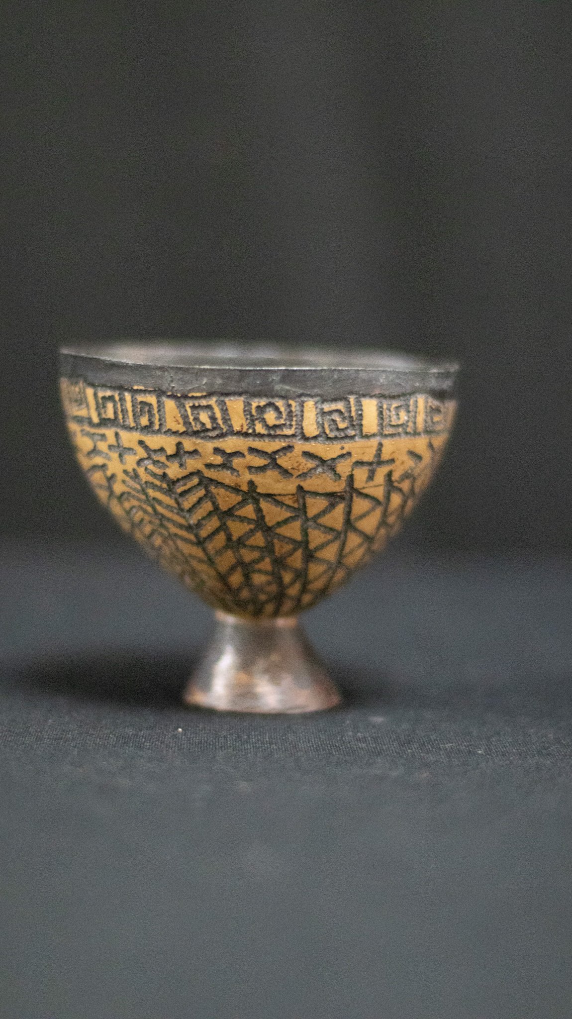 Recipiente em forma de cálice, confeccionado a partir do fruto maduro da cuieira (Crescentia cujete). Apresenta base circular levemente expandida, proporcionando estabilidade. A superfície externa é decorada com padrões geométricos incisos e pintados em preto, distribuídos em faixas distintas. A faixa superior exibe motivos lineares em espiral, enquanto a faixa intermediária contém formas cruzadas e padrões em grelha. A base do cálice também apresenta coloração escura. O interior do recipiente é tingido de preto.