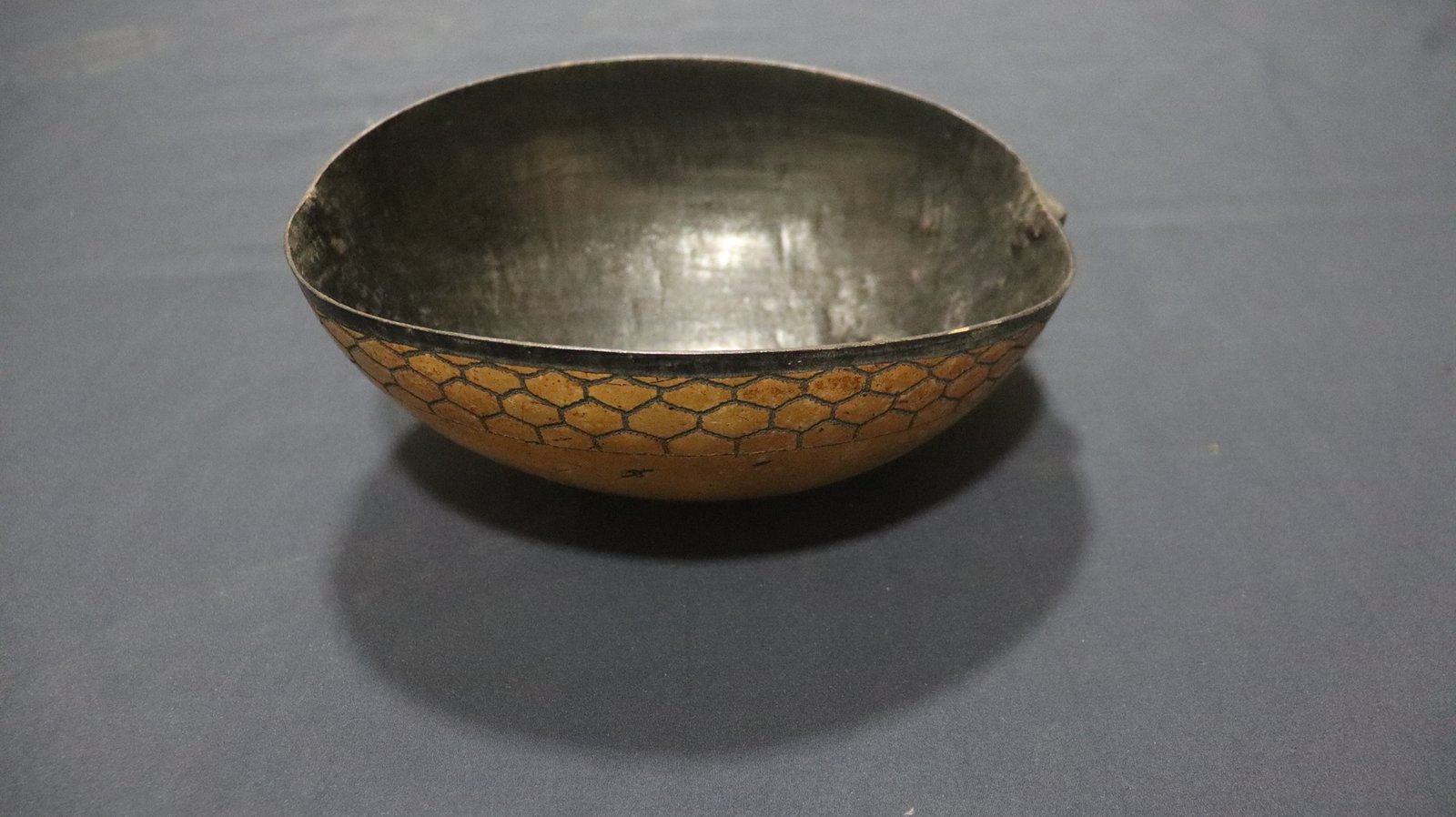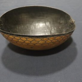 Recipiente esférico confeccionado a partir do fruto maduro da cuieira (Crescentia cujete), cortado ao meio e polido. A superfície externa apresenta uma faixa decorativa próxima à borda inferior, composta por um padrão de hexágonos alinhados, formando uma trama semelhante a escamas. A borda do objeto possui acabamento escuro, contrastando com a tonalidade amarelada da cuia. A parte superior mantém a coloração natural do material, sem tingimento.