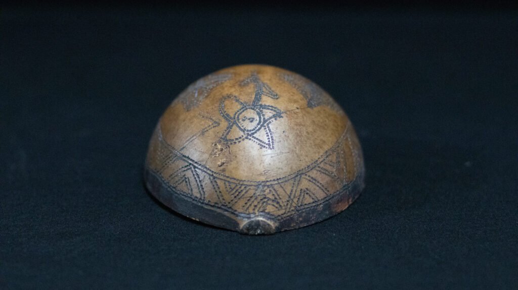 Cuia confeccionada a partir do fruto maduro da cuieira (Crescentia cujete), cortado para obtenção da forma desejada. A superfície externa é decorada com grafismos pretos aplicados por meio da técnica de pirografia, formando um padrão composto por figuras estilizadas. Os motivos incluem formas geométricas, como losangos e estrelas, além de representações que remetem a elementos naturais ou simbólicos. O grafismo é distribuído de maneira uniforme sobre a superfície. A extremidade superior da cuia apresenta uma pequena protuberância natural, característica do fruto.