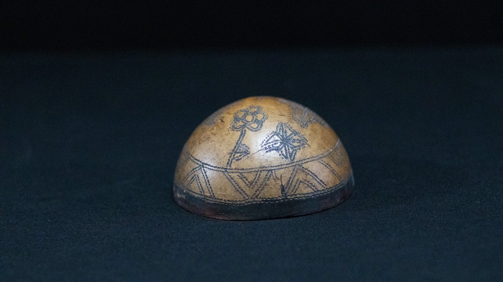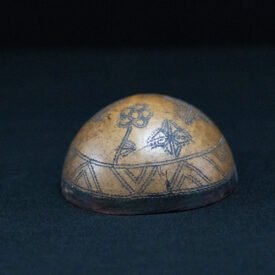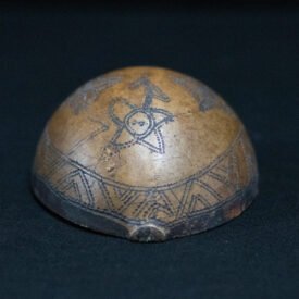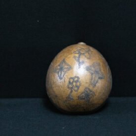 Cuia confeccionada a partir do fruto maduro da cuieira (Crescentia cujete), cortado para obtenção da forma desejada. A superfície externa é decorada com grafismos pretos aplicados por meio da técnica de pirografia, formando um padrão composto por figuras estilizadas. Os motivos incluem formas geométricas, como losangos e estrelas, além de representações que remetem a elementos naturais ou simbólicos. O grafismo é distribuído de maneira uniforme sobre a superfície. A extremidade superior da cuia apresenta uma pequena protuberância natural, característica do fruto.