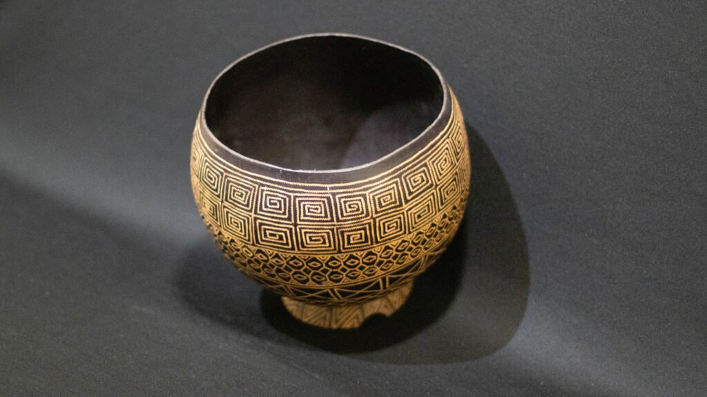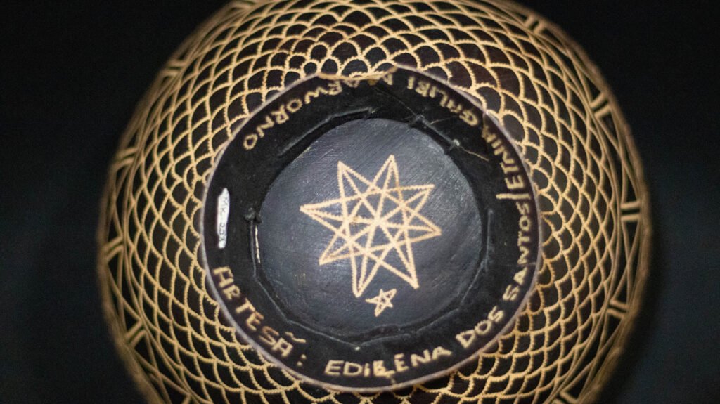 Recipiente de cuia em forma de taça, apresenta borda circular e lisa, bojo avantajado e repousa sobre pedestal da mesma metéria-prima. Exibe nas superfícies incisões geométricas formando linhas e marcas caminho da vida, kuahí, escama de peixe, dãdelo e jabuti, na base desenho de estrela. Possui o interior enegrecido com tinta de Kumatê.