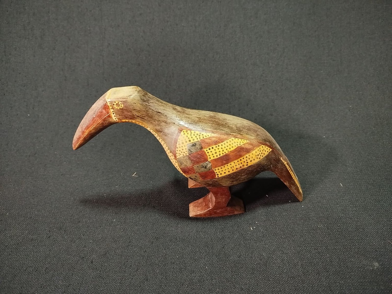 Escultura de madeira representando barco confeccionada com madeira caju. Apresenta no interior 1/4 de figuara humana e estrelas e na parte externa da borda, estrelas. Exibe figura humana e casco pintados com estrelas e makoko com tinta de urucum e cumatê.