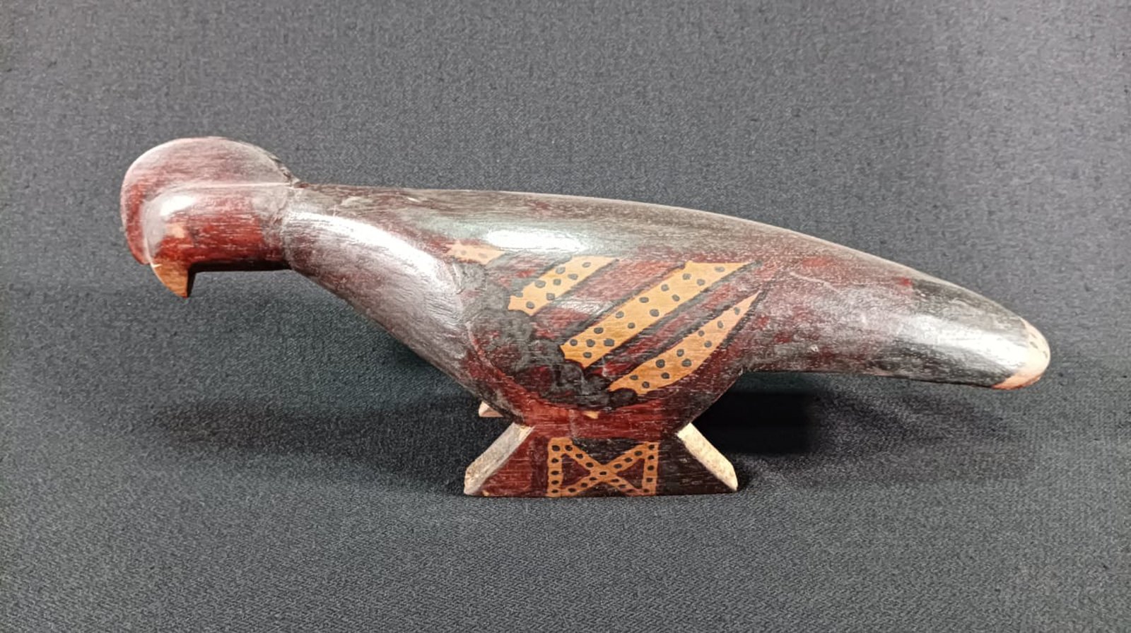 Escultura de madeira representando jabuti confeccionada com madeira caju. Apresenta casco pintado com marca do jabuti e sobre a cabeça estrela, makoko.