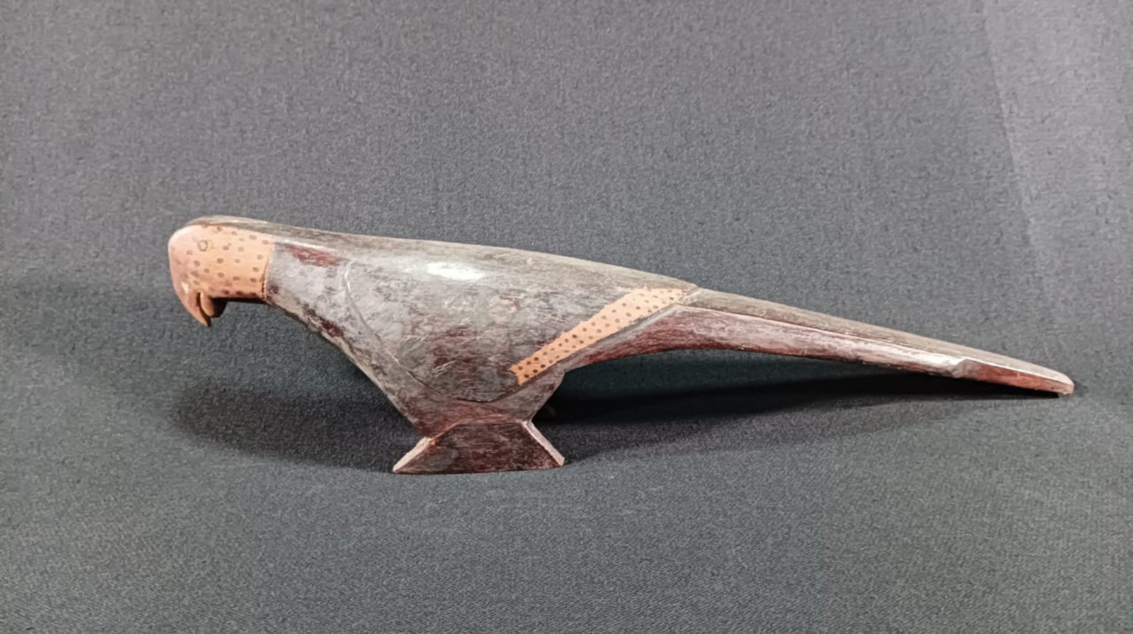 Escultura de madeira ornitomorfa (estilização de papagaio) confeccionado com madeira não identificada exibindo as asas fechadas e repousado sobre trilhos. Apresenta a superfície em torno dos olhos, partes das asas e trilhos decorados com pontos e as demais escuredidas.