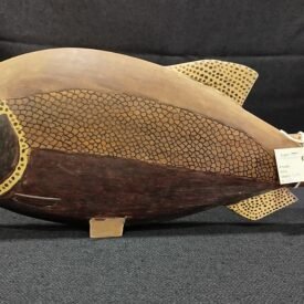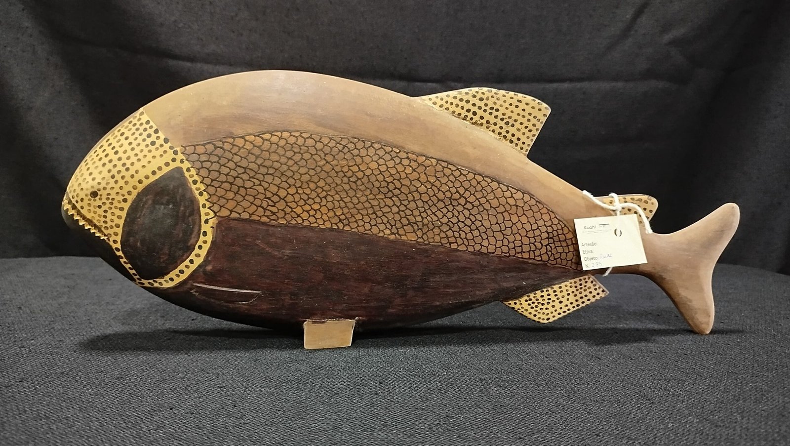 Escultura de madeira ictomorfa (representando peixe não identificado) confeccionado com madeira não identificada. Apresenta a região dos olhos e barbatanas decorados com pontos e corpo com pintura de escamas.