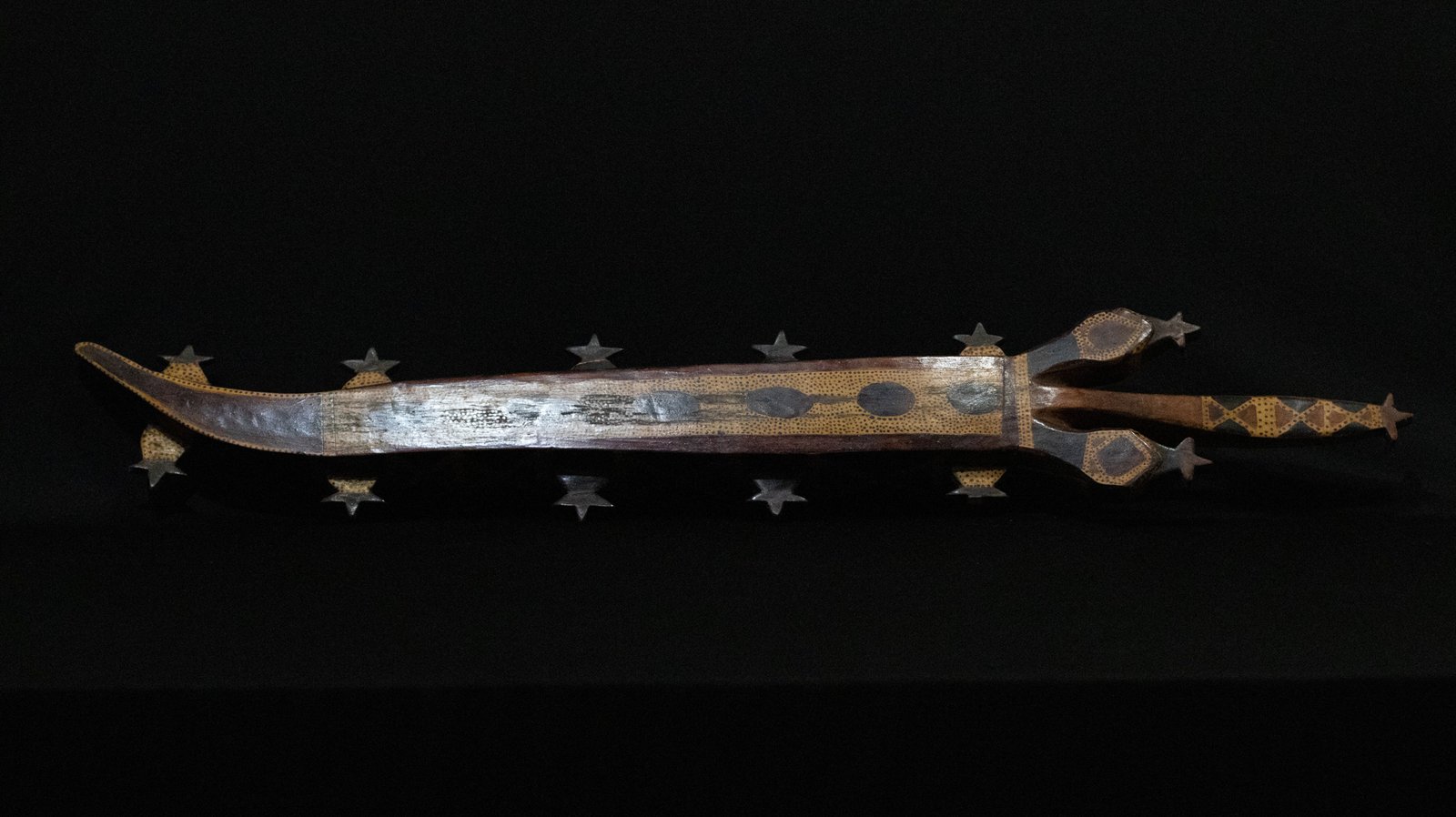 Escultura de madeira representando Kayeb (uma das constelações mais importantes do povo Palikur), confeccionada em madeira caju constituída de cauda, corpo alongado provido de duas cabeças, separadas por uma cauda. Apresenta em cada lateral cinco esculturas de estrelas e superfície decorada com marcas de Kuahí, makoko e estrelas pintados com com tinta de urucum e cumatê .