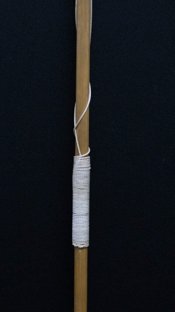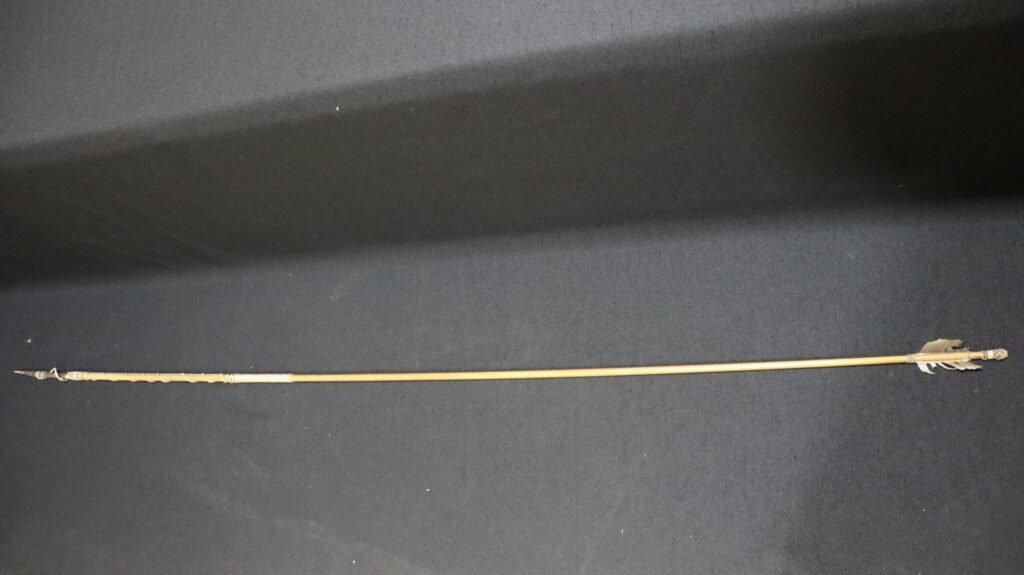 Flecha de ponteira lisa de ferro, presa na haste por um fio de nylon. É fixada a uma vareta e esta inserida na abertura cilíndrica da haste. É provida de emplumação radial de meias-penas atadas na extremidade basal da haste que serve para equilibrar a flecha e controlar sua trajetória.