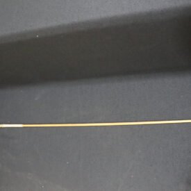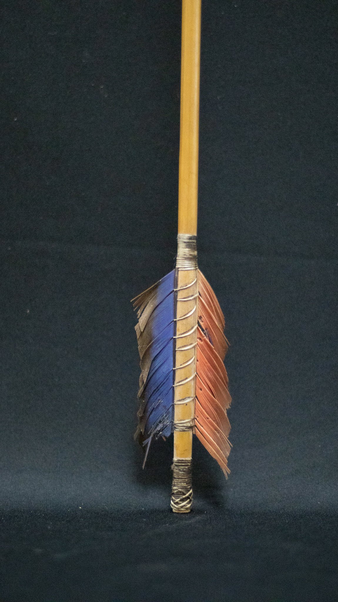 Flecha-sararaca espeque provida de ponta, haste e emplumação. Apresenta ponta de ferro tipo espeque, fixada a haste de madeira de marapinima que se encontra encaixada a haste de flecha. Possui emplumação radial com meias penas de mutum.