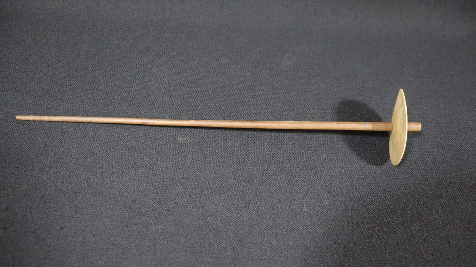 Madeira Marapinima talhada de forma roliça fina. Um pedaço de casco de tracajá cortado de forma bem redondo com um furo ao meio onde prende o pedaço de madeira.