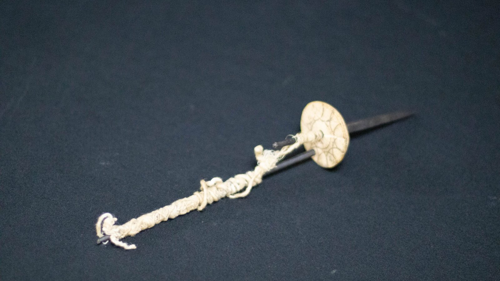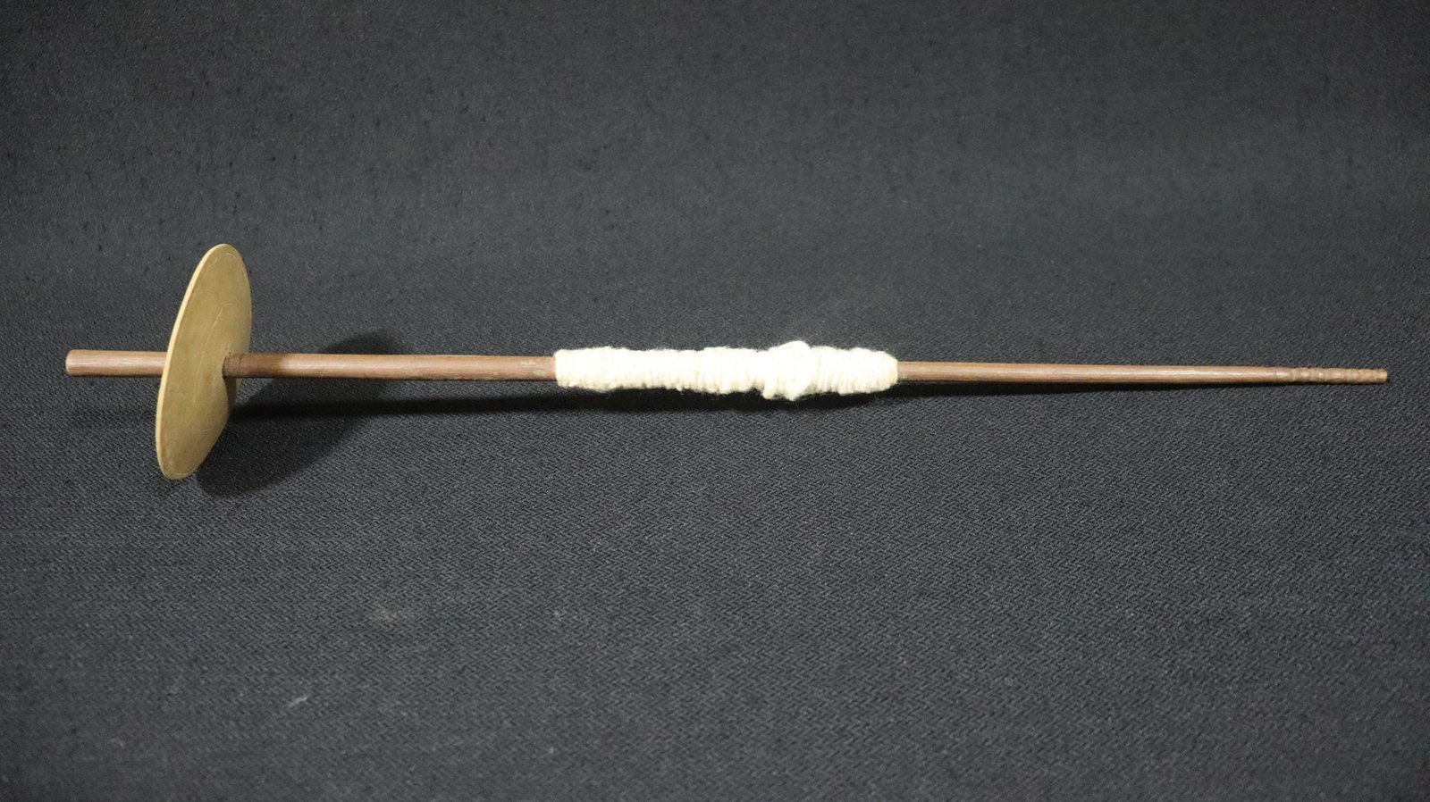Fuso constituído de castão chanfrado de madeira de Marapinima e tortual circular de carapaça de tracajá. Exibe superfície do tortual decorado com padrões circulares e castão envolvido com fios de algodão.
