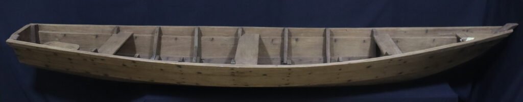 Igara talhada em casca de árvore de cupiúba, de conformação elíptica, fundo chato, uma falca de cada lado e soerguida na polpa. Apresenta proa e popa e dezoito braços segurando as falcas. Possui calefetação interna com tala de buriti e resina do breu.