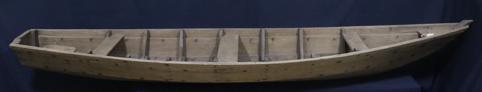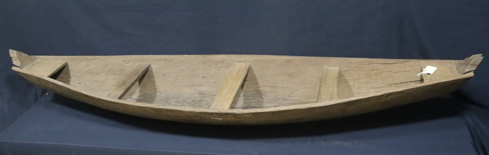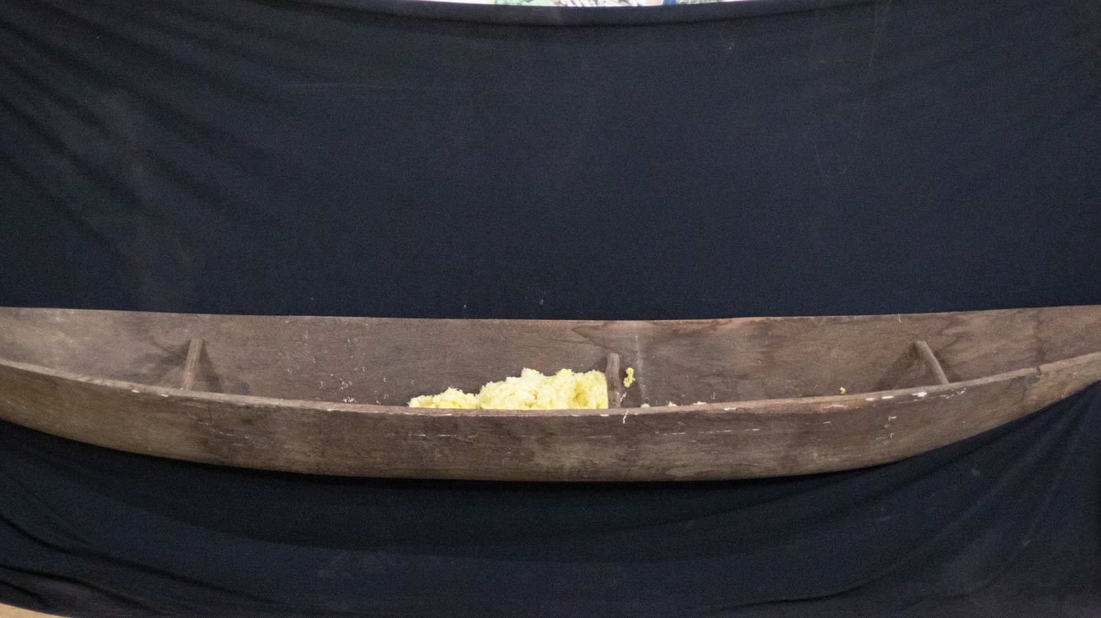 Igara talhada em casca de árvore não identificada, de conformação elíptica, fundo chato, uma falca na frente proa e polpa, calafetada, internamente, com tala de buriti e resina do breu.