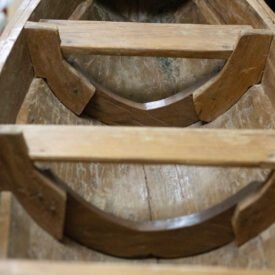 Embarcação talhada em casca de árvore, fundo chato, com uma falca na frente e atras, proa e popa, três braços segurando as falcas, calafetado com tala de buriti e resina do breu.