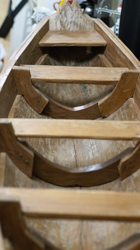 A madeira tem que ser boa e de tronco reto. A tora é lavrada com o machado de modo a tomar formato bruto do casco, cava-se com a goiva, fura em várias partes para quando colocar fogo por baixo a madeira amoleça rápido e não rachar, depois põe algumas tesouras nas partes da canoa para abri-la e dá um fundo mais largo, depois tira as partes queimadas com a enxó, prega as falcas, coloca três tabuas no meio e feche a proa e a popa. A última etapa é calafetar, tapar os buracos ou rachaduras com tala de buriti e breu.