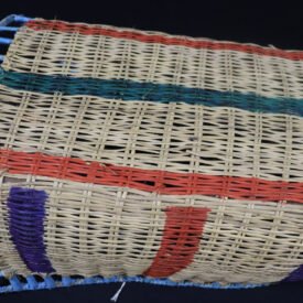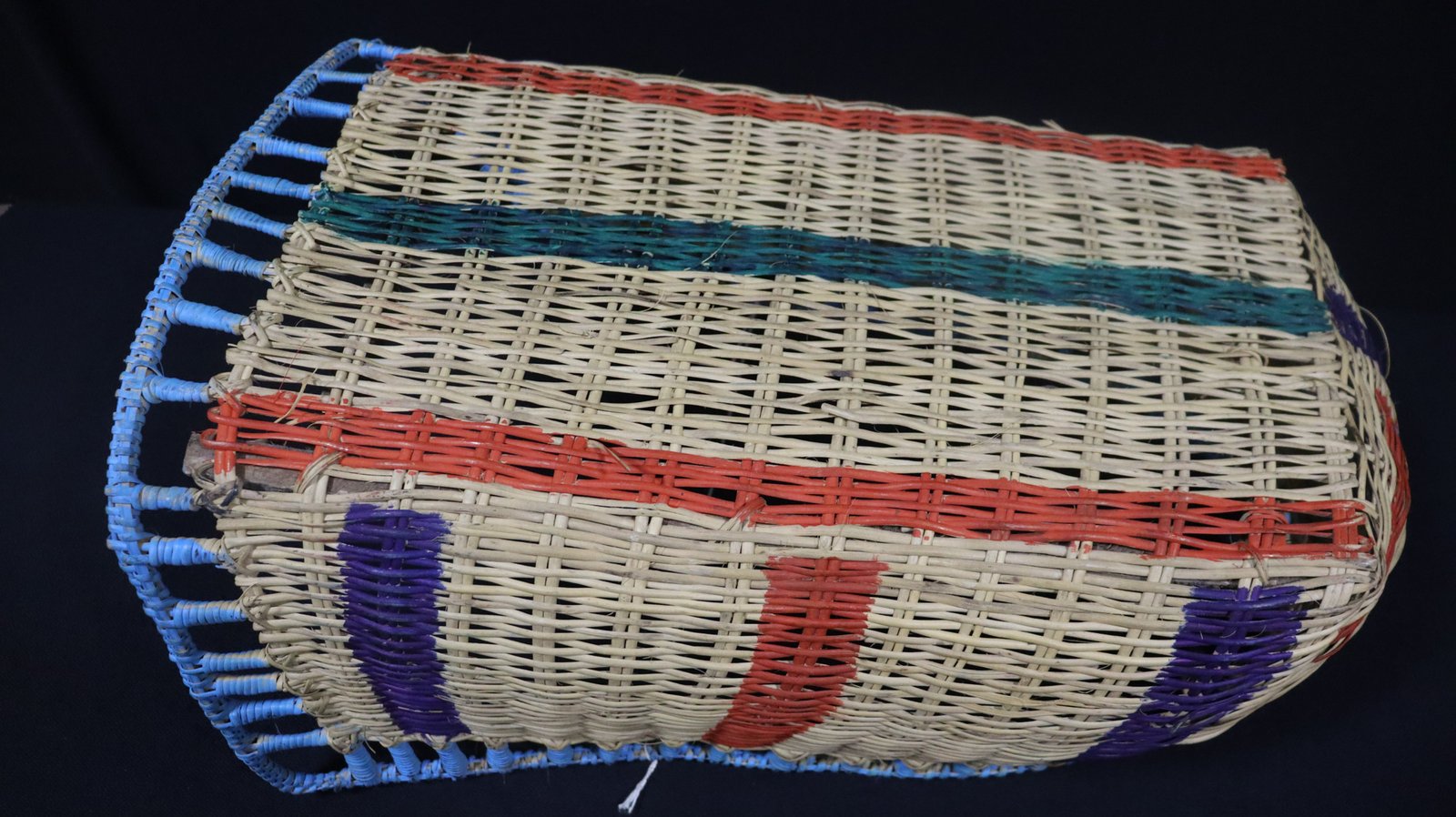 Jamaxim confeccionado com lasca de cipó titica segundo a técnica do arqueado. Possui suporte interno confeccionado com madeira não identificada e superfície decorada com listras horizontais nas cores vermelho e azul escuro tingidas com corante industrializado.