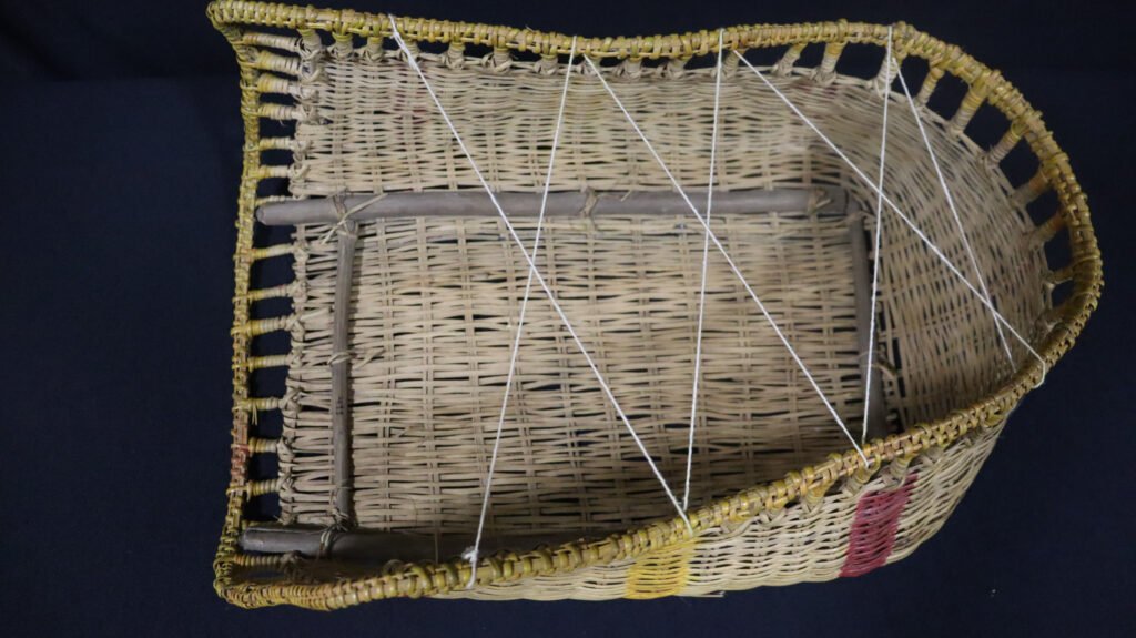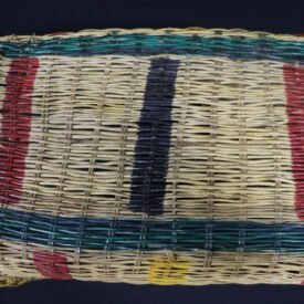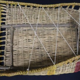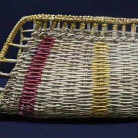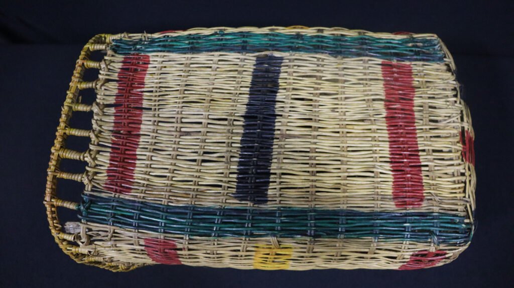 Jamaxim confeccionado com lasca de cipó titica segundo a técnica do arqueado. Possui suporte interna reforçada com madeira não identificada e superfície decorada com listras horizontais nas cores vermelho e amarelo tingidas com corante industrializado.