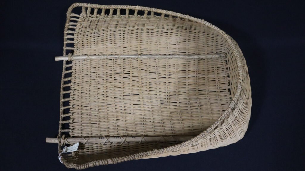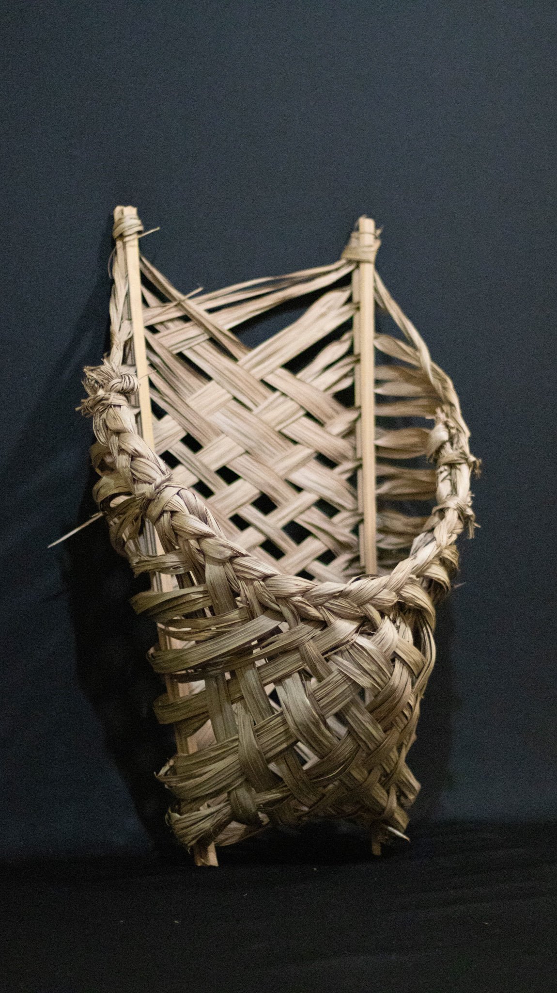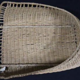 Jamaxim confeccionado com lasca de cipó titica segundo a técnica do arqueado. Possui suporte interno confeccionado com madeira não identificada.