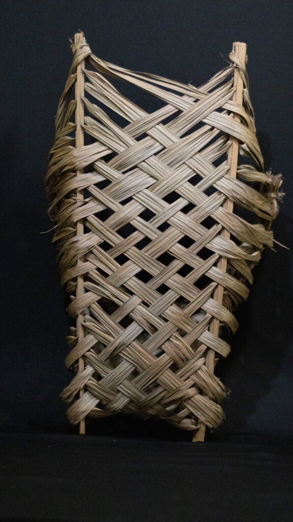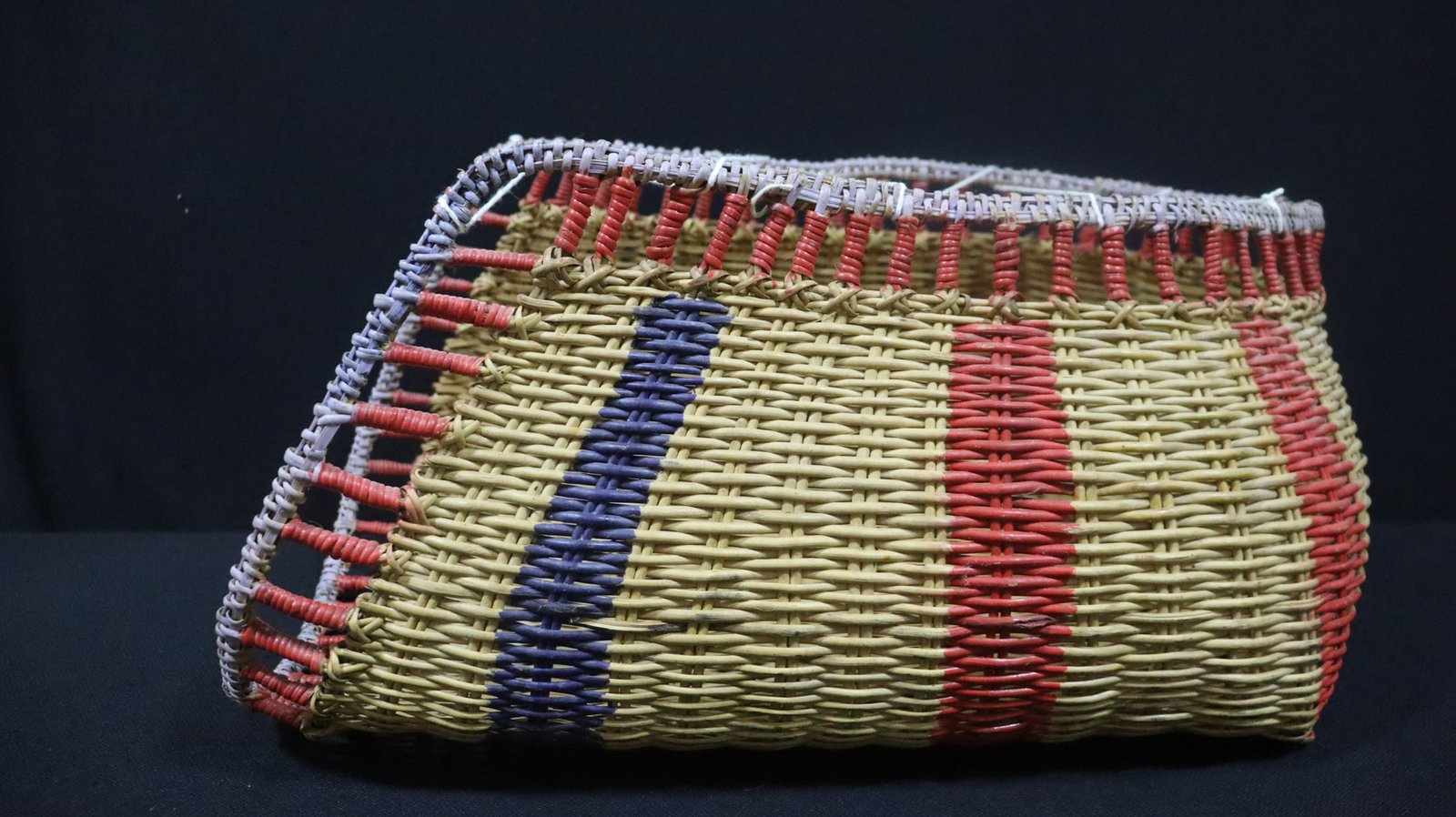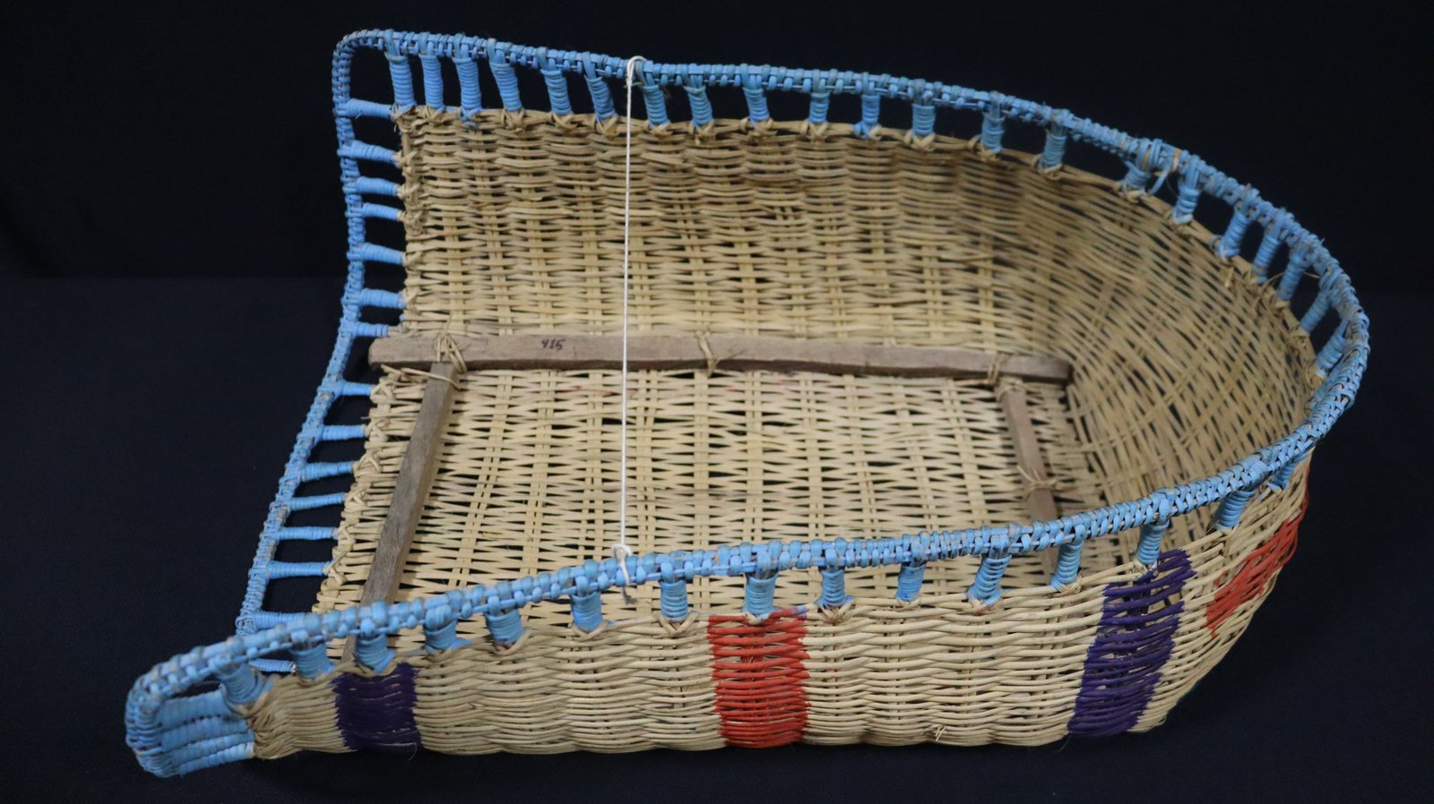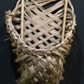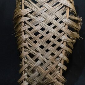 Jamaxim confeccionado com tala de guarumã segundo a técnica do trançado quadricular e acabamento da borda com trança.