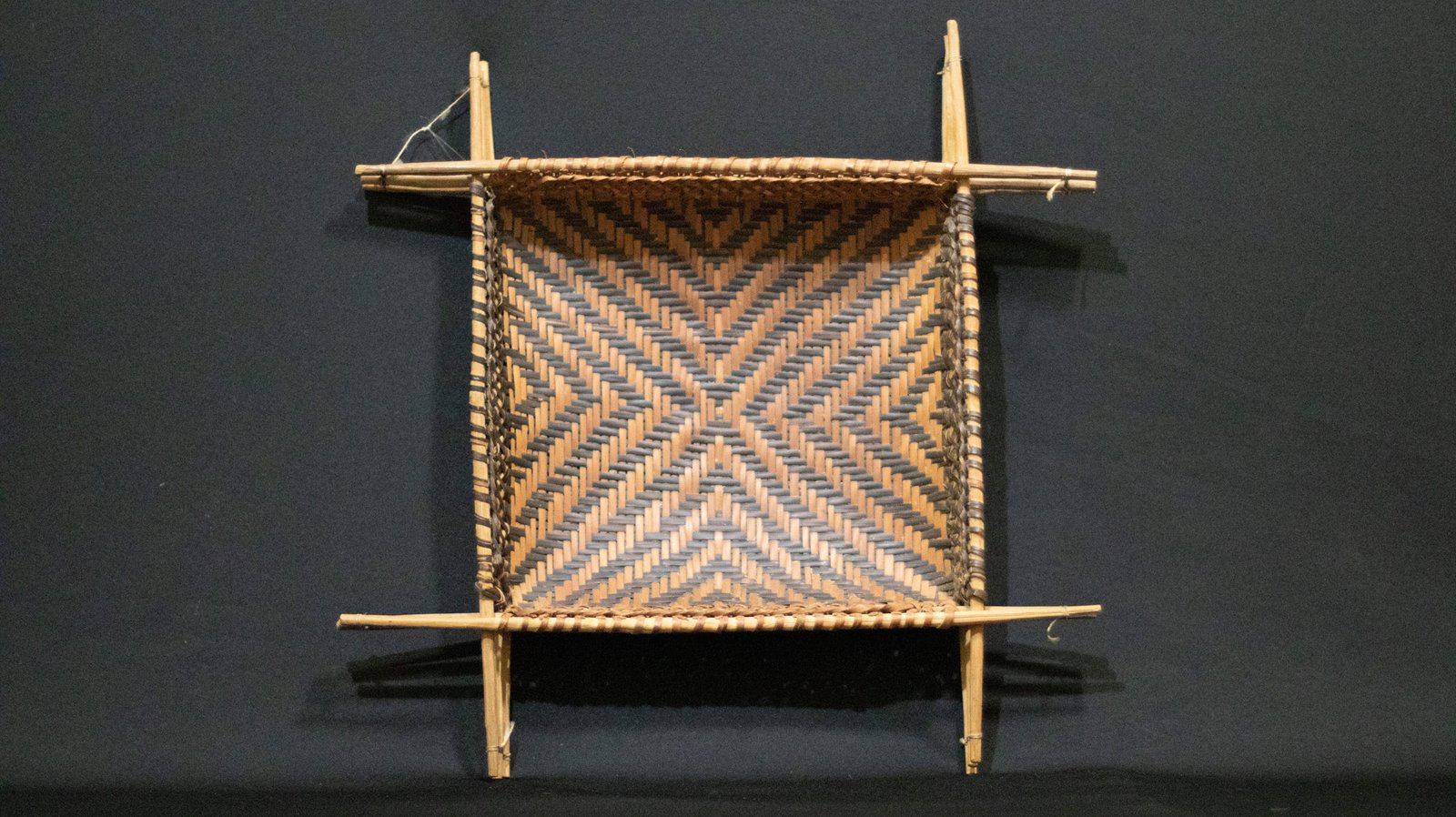 Peneira de conformação quadrangular confeccionado com tala de acitá segundo a técnica do quadricular. Possui borda com acabamento com aro duplo de madeira roliça não identificada.