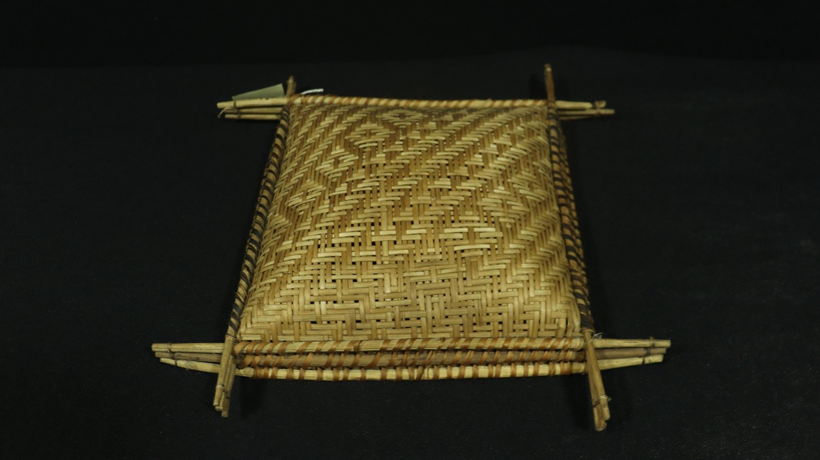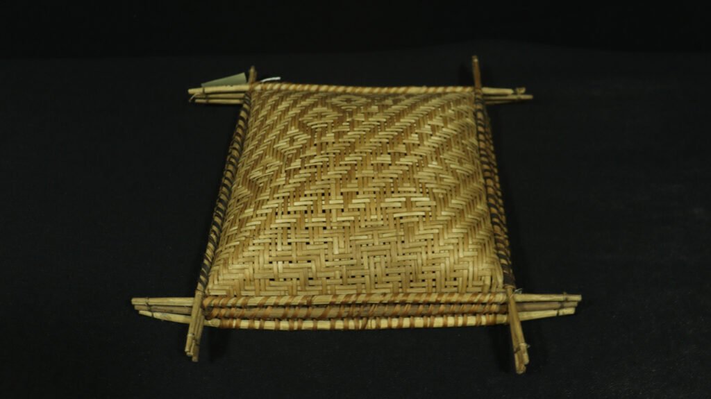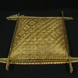 Peneira de conformação quadrangular confeccionado com tala de acitá segundo a técnica do sarjado nas cores natural e preto obtido pelo tingimento das fibras com corante não identicado criando padrões gemétrico característicos do povo. Possui borda com acabamento com aro duplo de madeira roliça não identificada.