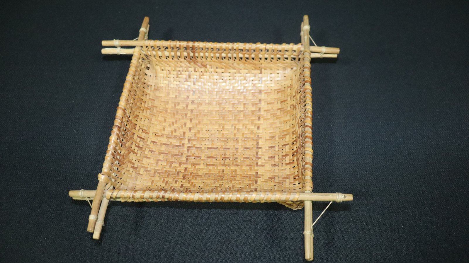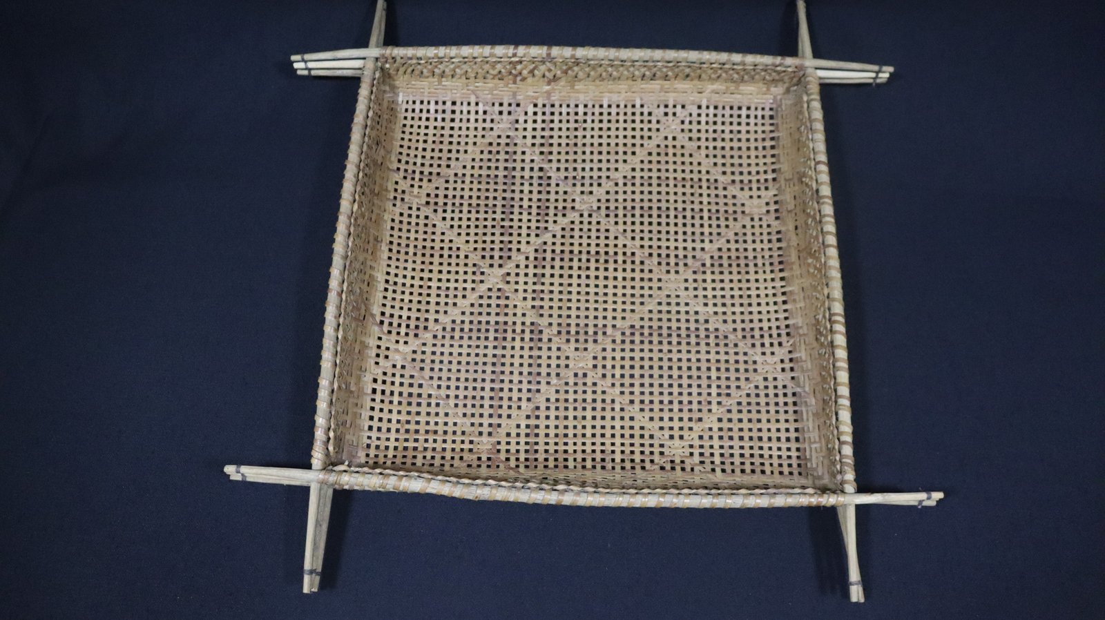 Peneira de conformação quadrangular confeccionado com fibra de guarumã segundo a técnica do quadricular formando, na superfície, padrões losangulares. Possui borda com acabamento com aro duplo de madeira roliça não identificada.