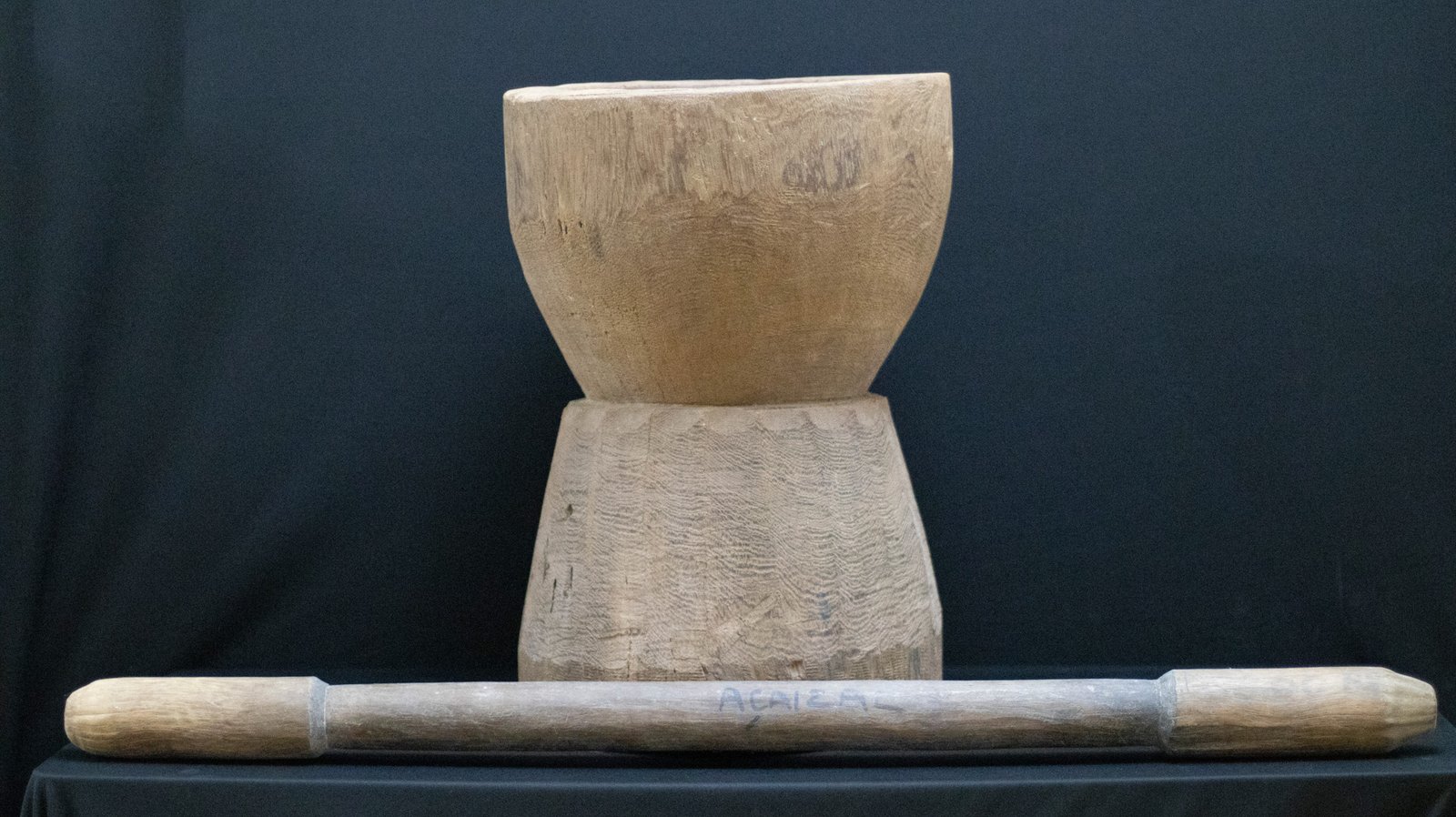 Pilão de madeira maciça, composto por um corpo único de formato vasiforme, caracterizado por uma estrutura simétrica em que a parte superior e inferior apresentam curvas opostas, resultando em uma silhueta semelhante a um duplo cone truncado. A base é mais larga, garantindo estabilidade, enquanto a boca do pilão é levemente arredondada e escavada para o processamento de alimentos. A peça acompanha um socador cilíndrico alongado, com extremidades arredondadas e superfície central levemente afilada.