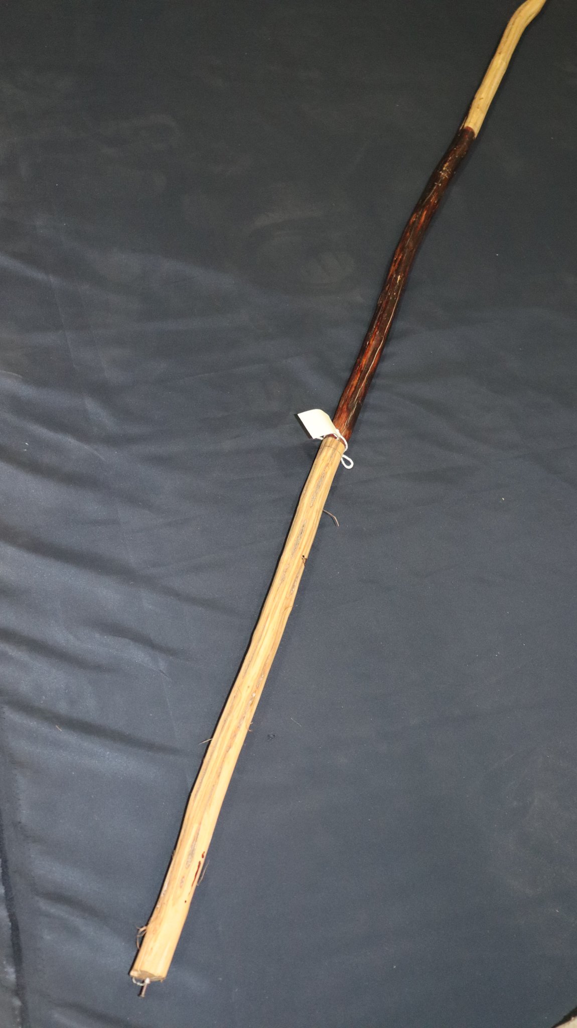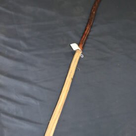Estaca de madeira roliça confeccionada com madeira não identificada, apresentando áreas em tonalidade escura e outras descascadas, revelando a cor natural da madeira. A estrutura possui variações na espessura ao longo do corpo. A superfície exibe sinais de desgaste, com trechos parcialmente descascados. Uma das extremidades apresenta uma ponta afilada. O contraste entre as áreas escuras e claras sugere possível tratamento ou remoção parcial da camada superficial da madeira.