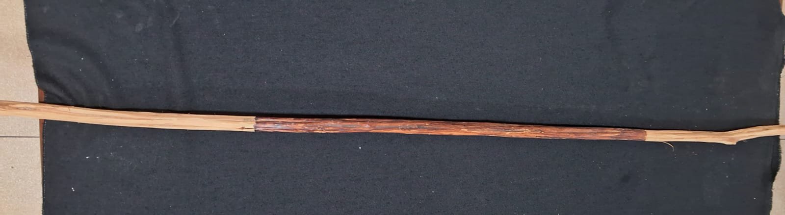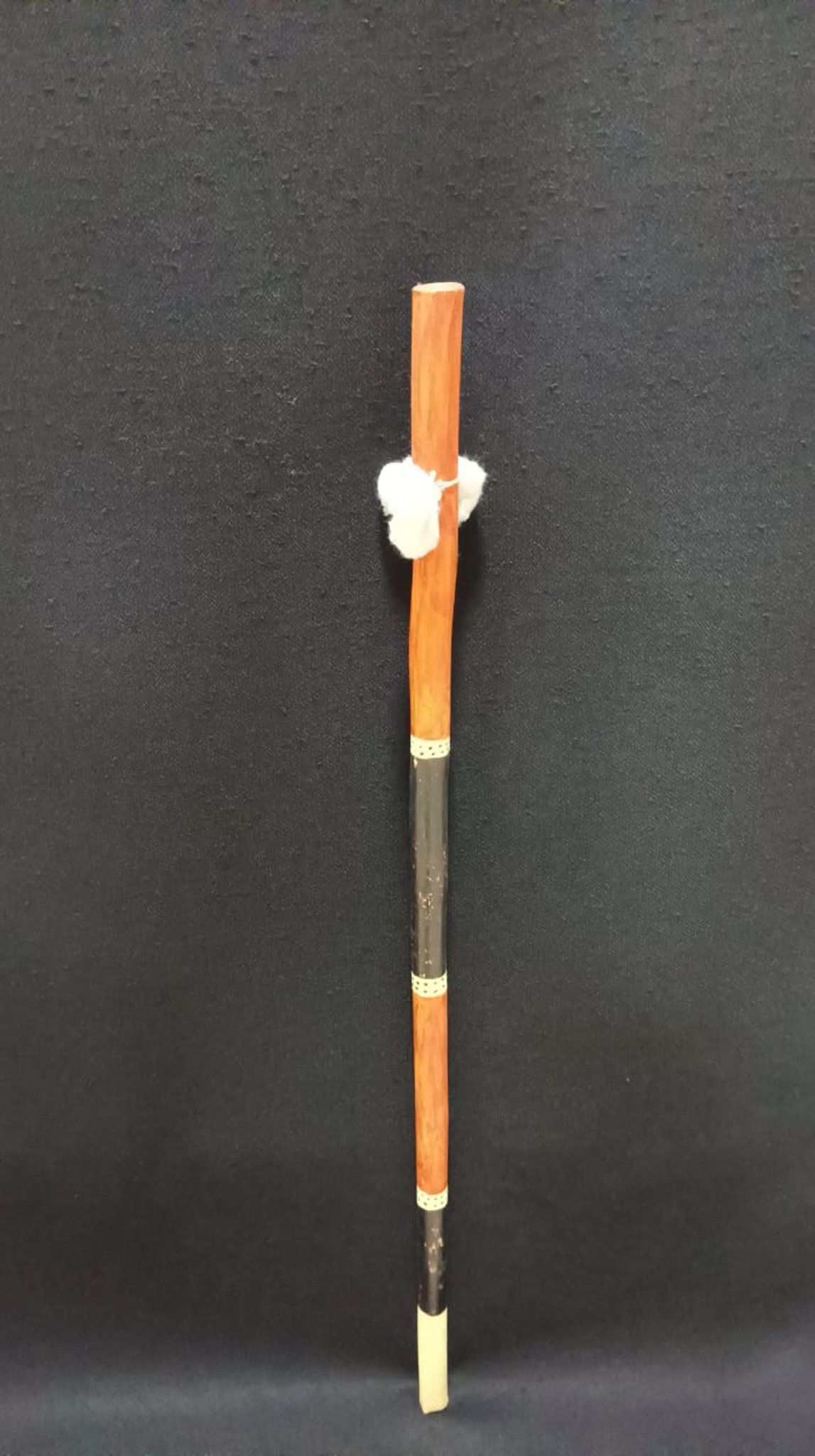 Estaca de madeira roliça confeccionada com madeira não identificada, apresentando faixas nas cores vermelha, preta e branca, sendo que a faixa branca exibe pequenos pontos. A estrutura é predominantemente reta, com superfície levemente irregular. Na extremidade proximal, há um tufo de algodão fixado com amarração. A extremidade distal possui uma seção esbranquiçada.